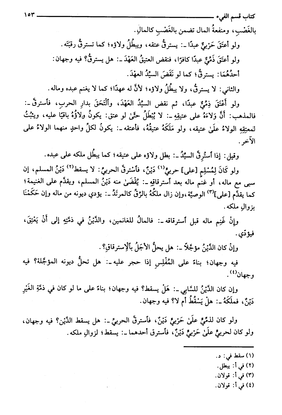 ولو كان لذمي على حربي دين، فاسترق الحربي-: هل يسقط الدين؟ فيه وجهان، ولو كان لحربي على حربي دينٌ، فاسترق أحدهما-: يسقط؛ لزوال ملكه.