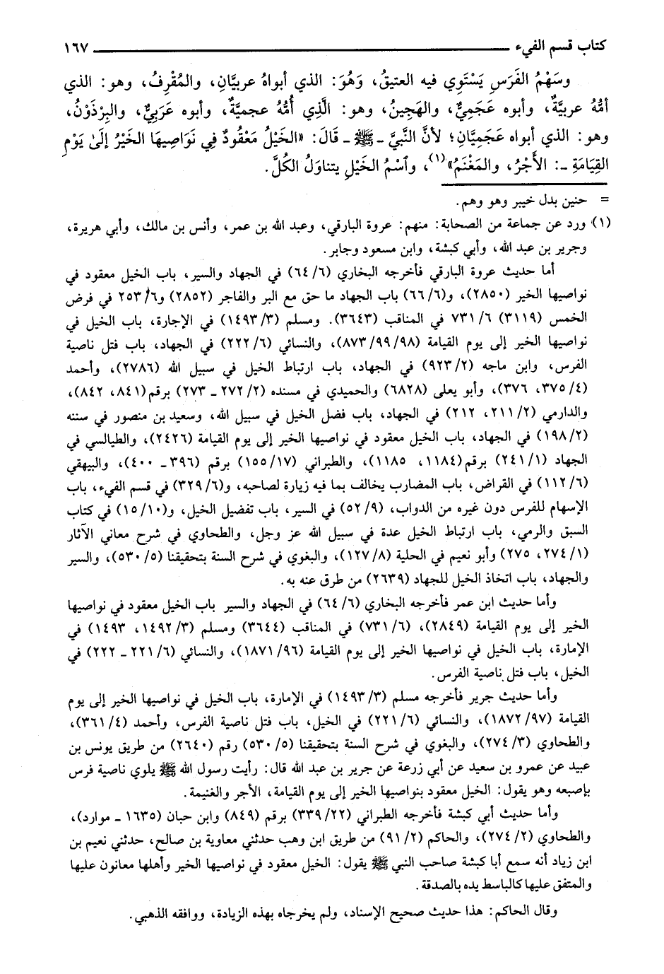وسهم الفرس يستوي فيه العتيق، وهو: الذي أبواه عربيان، والمُقرف، وهو: الذي أمه عربية، وأبوه عجمي، والهجين، وهو: الذي أمه عجمية، وأبوه عربي، والبرذون، وهو: الذي أبواه عجميان؛ لأن النبي - صلى الله عليه وسلم- قال: "الخيل معقود في نواصيها الخير على يوم القيامة-: الأجر، والمغنم"، واسم الخيل يتناول الكل.
