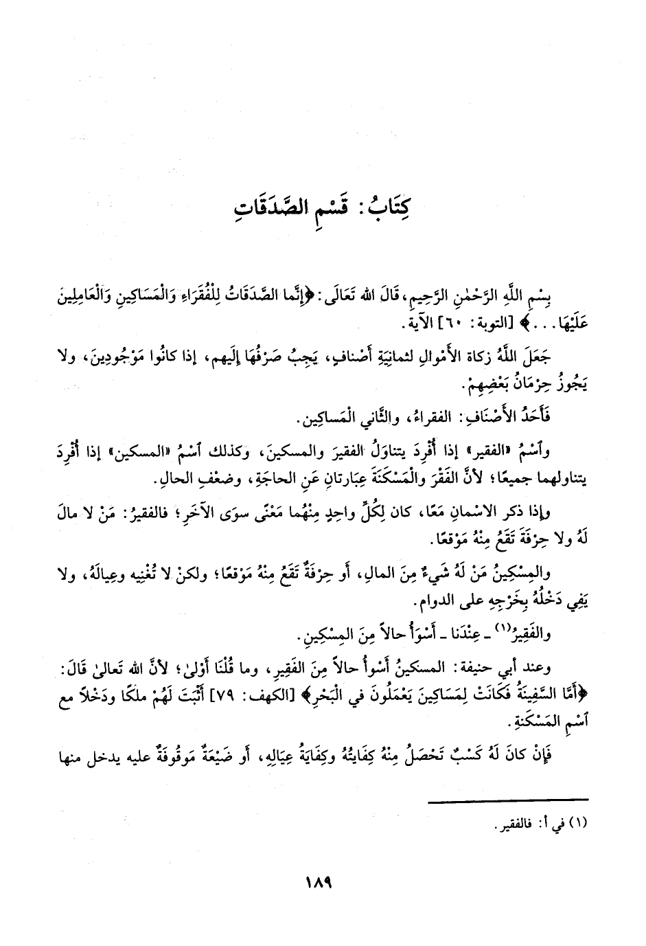 وعند أبي حنيفة: المسكين أسوأ حالاً من الفقير، وما قلنا أولى؛ لأن الله تعالى قال: {أَمَّا السَّفِينَةُ فَكَانَتْ لِمَسَاكِينَ يَعْمَلُونَ فِي الْبَحْرِ} [الكهف: 79] أثبت لهم ملكاً ودخلاً مع اسم المسكنة.