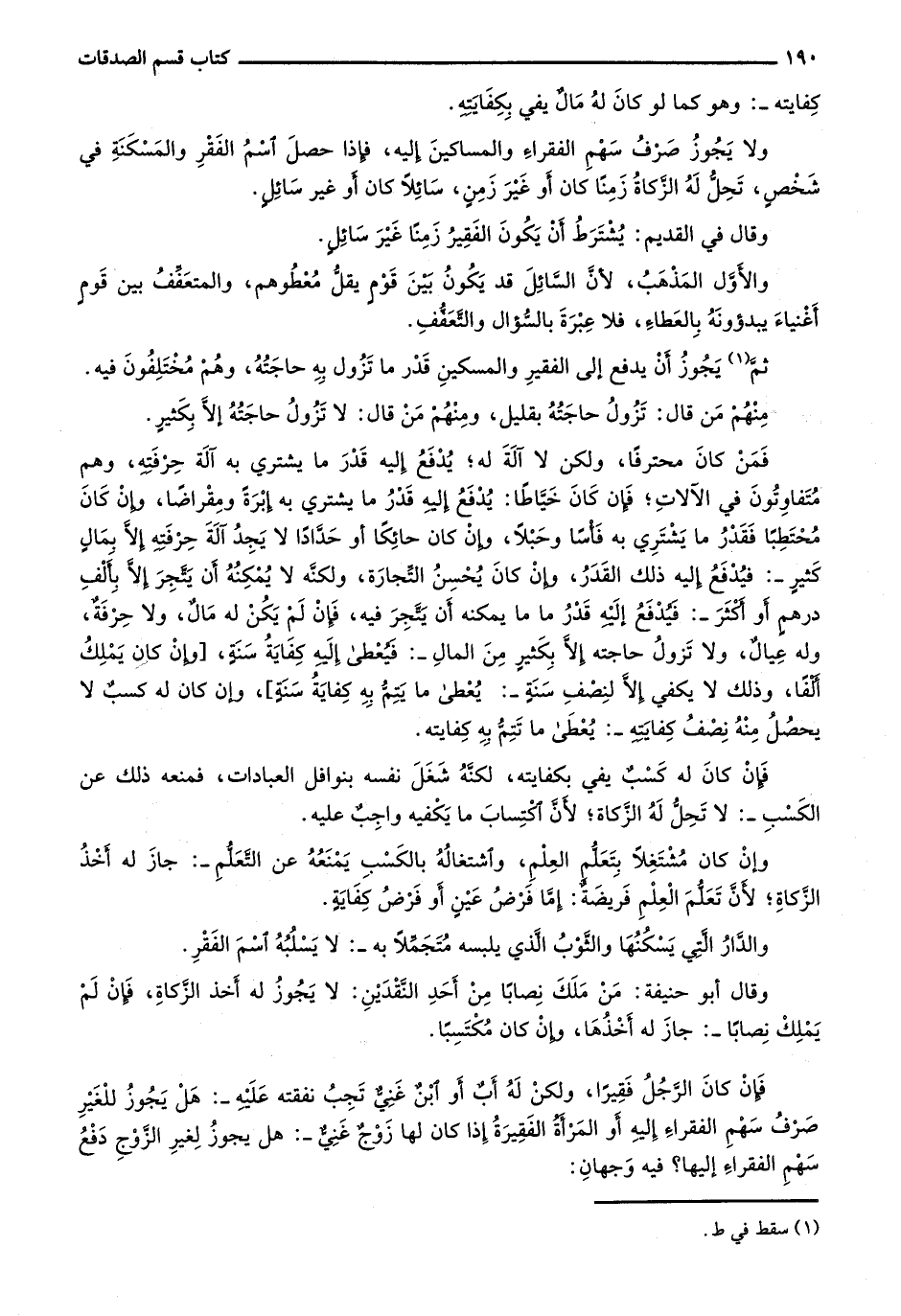 فمن كان محترفاً، ولكن لا آلة له؛ يُدفع إليه قدر ما يشتري به آلة حرفته، وهم متفاوتون في الآلات؛ فإن كان خياطاً: يُدفع إليه قدر ما يشتري به إبرة ومقراضاً، وإن كنا محتطبا فقدر ما يشتري به فأساً وحبلاً، وإن كان حائكاً أو حداداً لا يجد آلة حرفته إلا بمال كثير-: فيدفع إليه ذلك القدر، وإن كان يحسن التجارة، ولكنه لا يمكنه أن يتجر إلا بألف درهم أو أكثر-: فيدفع إليه قدر ما يمكنه أن يتجر فيه، فإن لم يكن له مال، ولا حرفة، وله عيال، ولا تزول حاجته إلا بكثير من المال-: فيعطى إليه كفاية سنة، [وإن كان يملك ألفاً، وذلك لا يكفي إلا لنصف سنة-: يُعطى ما يتم به كفاية سنة]، وإن كان له كسب لا يحصل منه نصف كفايته-: يعطى ما تتم به كفايته.
