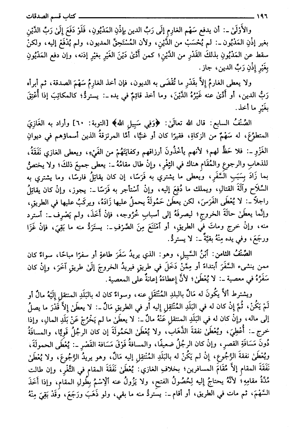 الصنف السابع: قال الله تعالى: {وَفِي سَبِيلِ اللَّهِ} [التوبة: 60] وأراد به الغازي المتطوع، له سهم من الزكاة، فقيراً كان أو غنياً، أما المرتزقة الذين أسماؤهم في ديوان الغزو-: فلا حَظَّ لهم؛ لأنهم يأخذون أرزاقهم وكفايتهم من الفيء، ويعطى الغازي نفقة، للذهاب والرجوع والمقُام هناك في الثغر، وإن طال مقامه-: يعطى جميع ذلك؛ ولا يختص بما زاد بسبب السفر، ويعطى ما يشتري به فرساً، عن كان يقاتل فارساً، وما يشتري به السلاح وآلة القتال، ويملك ما دُفع إليه، وإن استأجر به فرساً-: يجوز، وإن كان يقاتل راجلاً-: لا يُعطى الفرس، لكن يعطى حمولة يحمل عليها زاده، ويركب عليها في الطريق، وإنما يعطى حالة الخروج؛ ليصرفه إلى أسباب خروجه، فإن أخذ، ولم يصرف-: استرد منه، وإن خرج ومات في الطريق، أو امتنع من الصرف-: يسترد منه ما بقي، فإن غزا ورجع، وفي يده منه بقية-: لا يسترد.