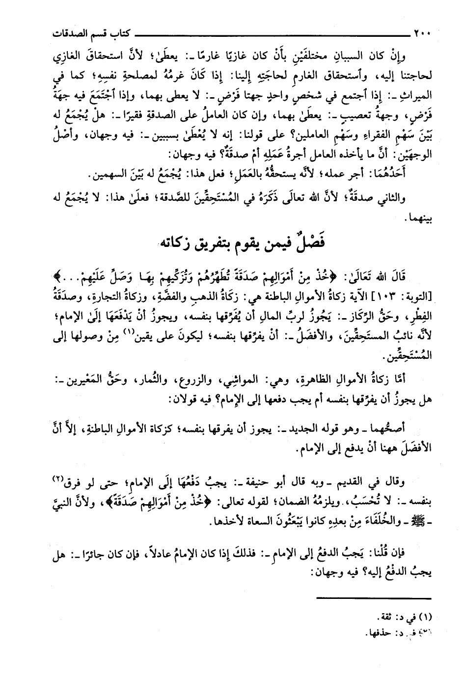 وقال في القديم- وبه قال أبو حنيفة-: يجب دفعها إلى الإمام؛ حتى لو فرق بنفسه-: لا تُحسب، ويلزمه الضمان؛ لقوله تعالى: {خُذْ مِنْ أَمْوَالِهِمْ صَدَقَةً} ولأن النبي - صلى الله عليه وسلم- والخلفاء من بعده كانوا يبعثون السعاة لأخذها.