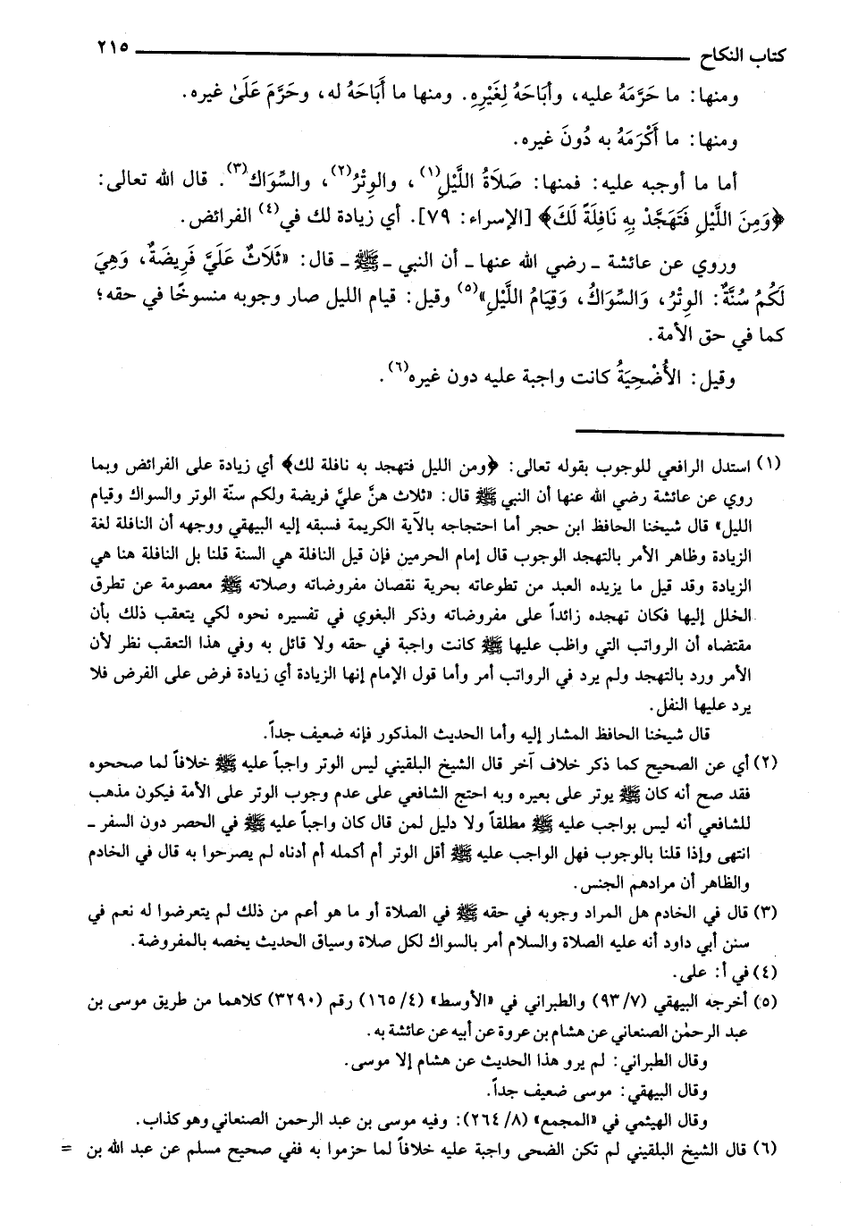 وروي عن عائشة - رضي الله عنها- أن النبي - صلى الله عليه وسلم - قال: "ثلاث على فريضة، وهي لكم سنة: الوتر، والسواك، وقيام الليل" وقيل: قيام الليل صار وجوبه منسوخاً في حقه؛ كما في حق الأمة.