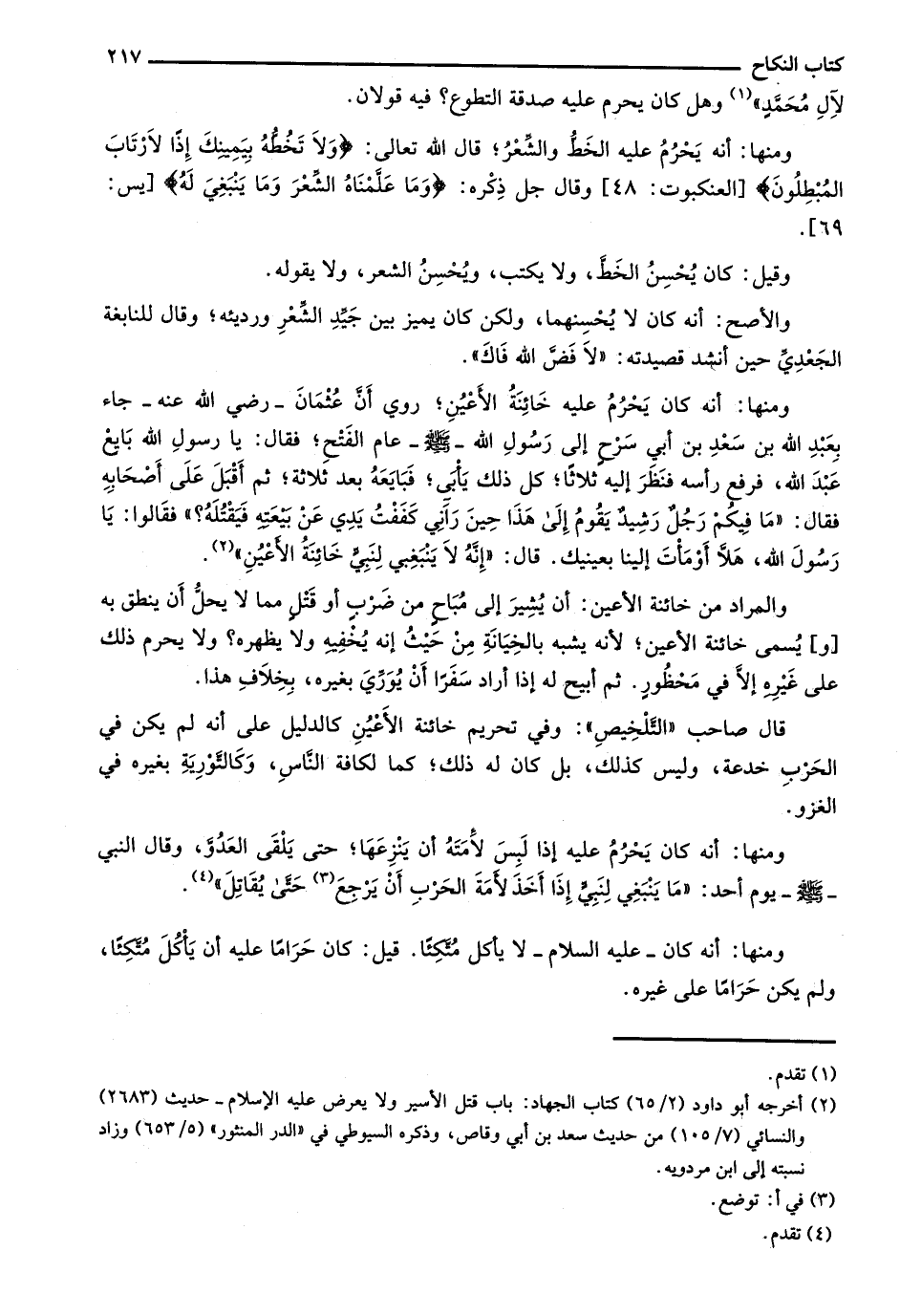 ومنها: أنه كان يحرم عليه خائنة الأعين؛ روي أن عثمان - رضي الله عنه- جاء بعبد الله بن سعد بن أبي سرح إلى رسول الله - صلى الله عليه وسلم - عام الفتح؛ فقال: يا رسول الله بايع عبد الله، فرفع رأسه فنظر إليه ثلاثاً؛ كل ذلك يأبى؛ فبايعه بعد ثلاثة؛ ثم أقبل على أصحابه فقال: "ما فيكم رجل رشيد يقوم إلى هذا حين رآني كففت يدي عن بيعته فيقتله؟ " فقالوا: يا رسول الله، هلا أومأت إلينا بعينيك. قال: "إنه لا ينبغي لنبي خائنة الأعين".