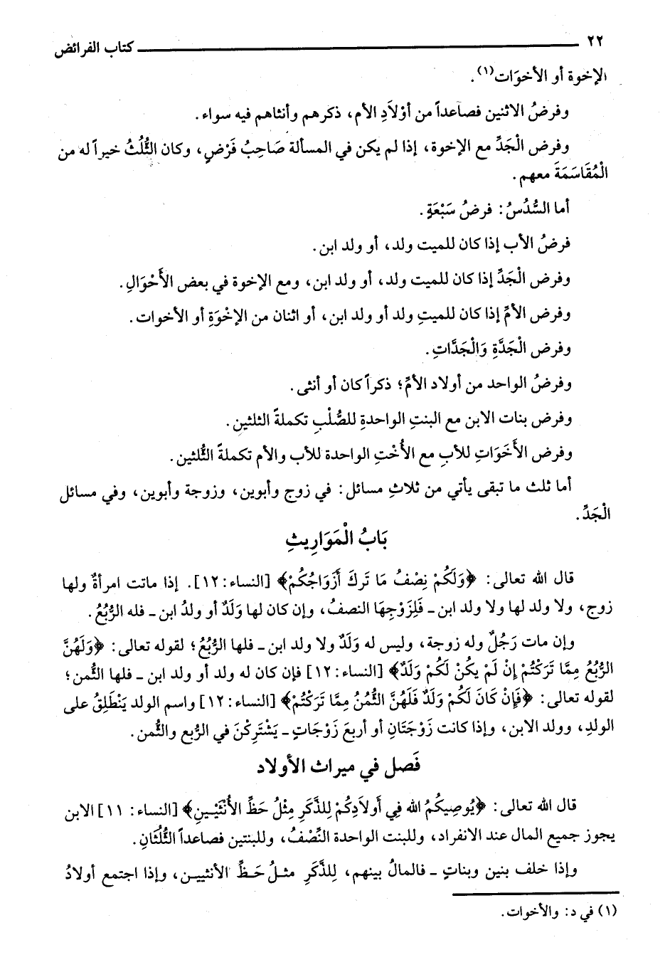 قال الله تعالى: {يُوصِيكُمْ اللَّهُ فِي أَوْلادِكُمْ لِلذَّكَرِ مِثْلُ حَظِّ الأُنثَيَيْنِ} [النساء: 11] الابن يجوز جميع المال عند الانفراد، وللبنت الواحدة النصف، وللبنتين فصاعداً الثلثان.