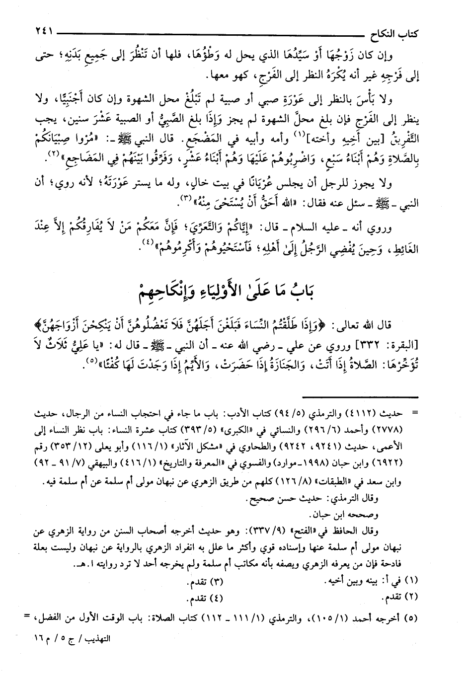 ولا بأس بالنظر إلى عورة صبي أو صبية لم تبلغ محل الشهوة وإن كان أجنبياً، ولا ينظر إلى الفرج فإن بلغ محل الشهوة لم يجز وإذا بلغ الصبي أو الصبية عشر سنين، يجب التفريق [بين أخيه وأخته] وأمه وأبيه في المضجع. قال النبي - صلى الله عليه وسلم -: "مُروا صبيانكم بالصلاة وهم أبناء سبع، واضربوهم عليها وهم أبناء عشر، وفرقوا بينهم في المضاجع".