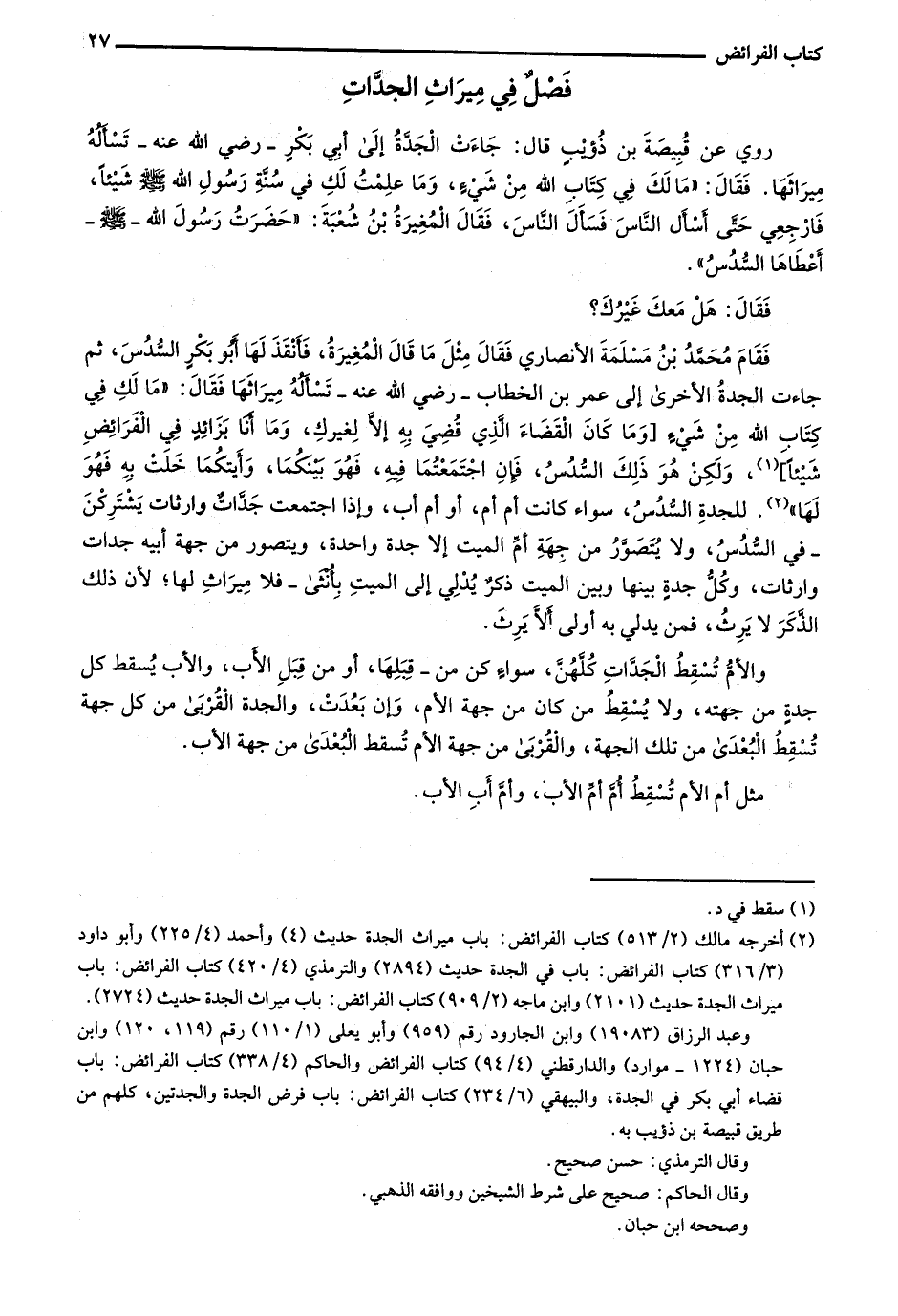 فقام محمد بن مسلمة الأنصاري فقال مثل ما قال المغيرة، فأنقذ لها أبو بكر السدس، ثم جاءت الجدة الأخرى إلى عمر بن الخطاب - رضي الله عنه - تسأله ميراثها فقال: "ما لك في كتاب الله من شيء [وما كان القضاء الذي قُضي به إلا لغيرك، وما أنا بزائد في الفرائض شيئاً]، ولكن هو ذلك السدس، فإن اجتمعتما فيه، فهو بينكما، وأيتكما خلت به فهو لها". للجدة السدس، سواء كانت أم أم، أو أم أب، وإذا اجتمعت جدات وارثات يشتركن - في السدس، ولا يتصور من جهة أم الميت إلا جدة واحدة، ويتصور من جهة أبيه جدات وارثات، وكل جدة بينها وبين الميت ذكر يدلي إلى الميت بأنثى - فلا ميراث لها؛ لأن لك الذكر لا يرث، فمن يدي به أولى ألا يرث.