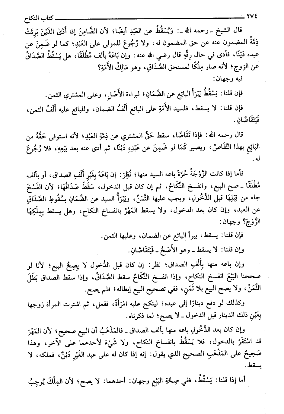 قال الشيخ -رحمه الله-: ويُسقط عن العبد أيضاً؛ لان الضامن إذا أدى الدين برئت ذمة المضمون عنه عن حق المضمون له، ولا رجوع للمولى على العبد؛ ما لو ضمن عن عبده ديناً، فأدى في حال رقه قال رضي الله عنه: وإن باعه بألف مطلقاً، هل يسقط الصداق عن الزوج؛ لأنه صار ملكاً لمستحق الصداق، وهو مالك الأمة؟