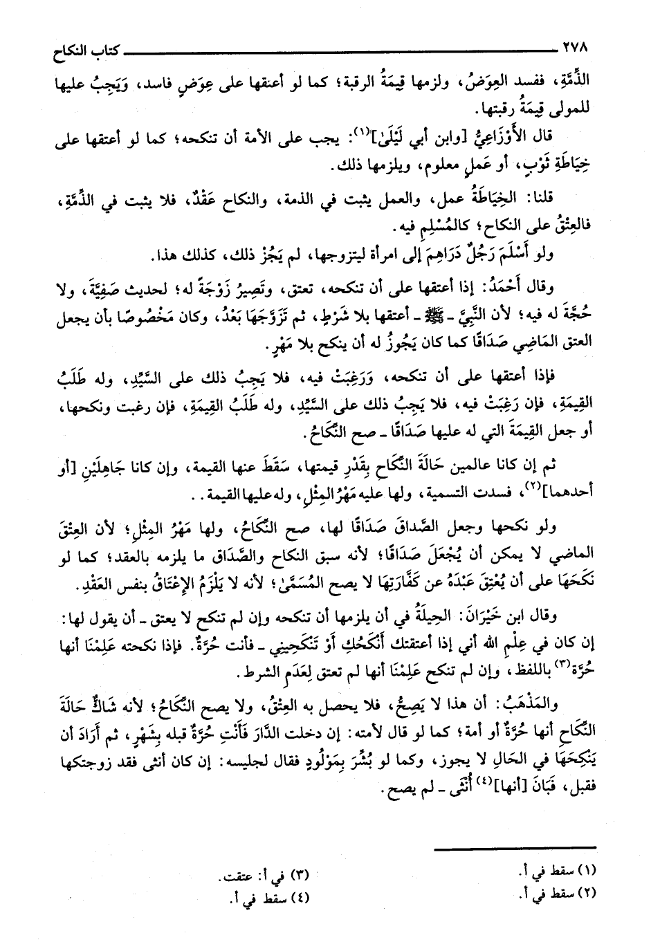 وقال أحمد: إذا أعتقها على أن تنكحه، تعتق، وتصير زوجة له؛ لحديث صفية، ولا حجة له فيه؛ لأن النبي - صلى الله عليه وسلم - أعتقها بلا شرط، ثم تزوجها بعد، وكان مخصوصاً بأن يجعل العتق الماضي صداقاً كما كان يجوز له أن ينكح بلا مهر.