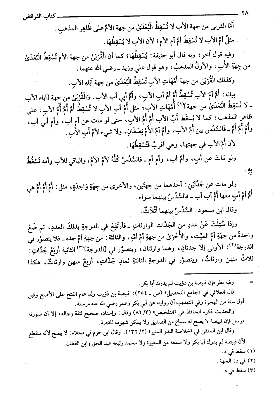 بيانه: أم أم الأب تسقط أم أم أب الأب، وأم أبي أب الأب. والقربى من جهة [آباء الأب - لا تسقط البعدي من جهة] أمهات الأب؛ مثل أم أب الأب لا تسقط أم أم أم الأب، على ظاهر المذهب؛ كما لا يُسقط أب الأب أم أم الأب، حتى لو مات عن أم أب، وأم أبي أب، وأم أم أم - فالسدس بين أم الأب، وأم أم الأم نصفان، ولا شيء لأم أب الأب.