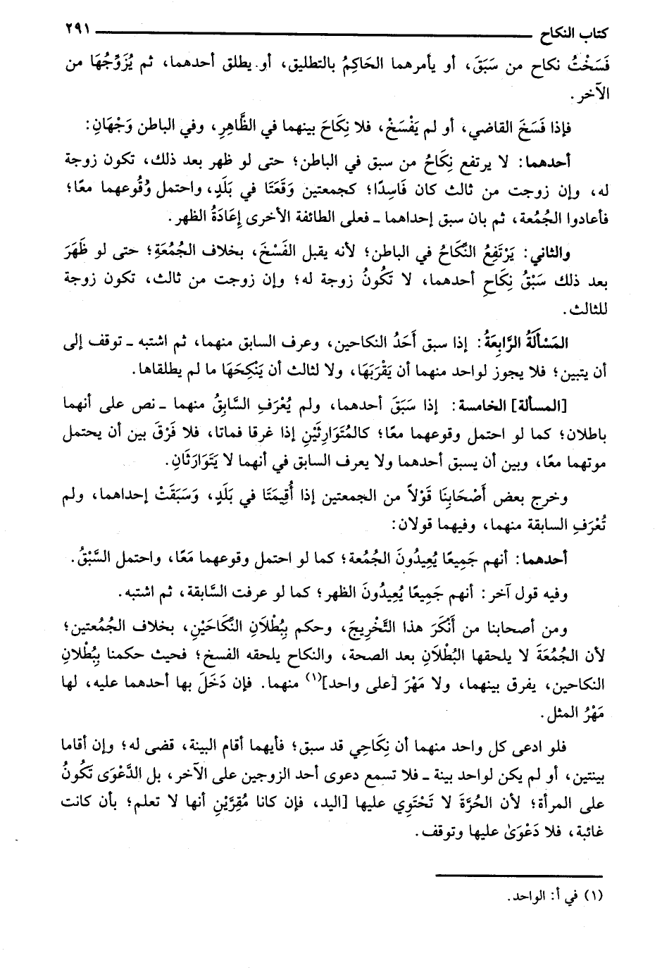 المسألة الرابعة: إذا سبق أحد النكاحين، وعرف السابق منهما، ثم اشتبه - نوقف إلى أن يتبين؛ فلا يجوز لواحد منهما أن يقربها، ولا لثالث أن ينكحها ما لم يطلقاها.