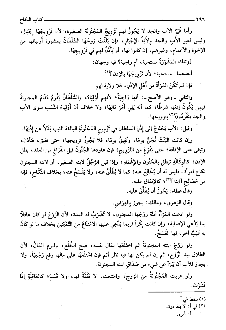 وإن كانت البنت تُجن يوماً، وتفيق يوماً، فلا يجوز تزويجها؛ حتى تفيق، فتأذن، وتبقى على الإفاقة؛ حتى يفرغ من التزويج؛ فإن عاودها الجنون قبل الفراغ من العقد، بطل الإذن؛ كالوكالة تبطل بالجنون والإغماء؛ وإذا قبل الرجل لابنه الصغير، أو لابنه المجنون نكاح امرأة -فليس له أن يخالع عنه؛ كما لا يطلق عنه، ولا يفسخ عنه؛ بخلاف النكاح؛ فإنه من مصالح [ابنه]؛ كالإنفاق عليه.