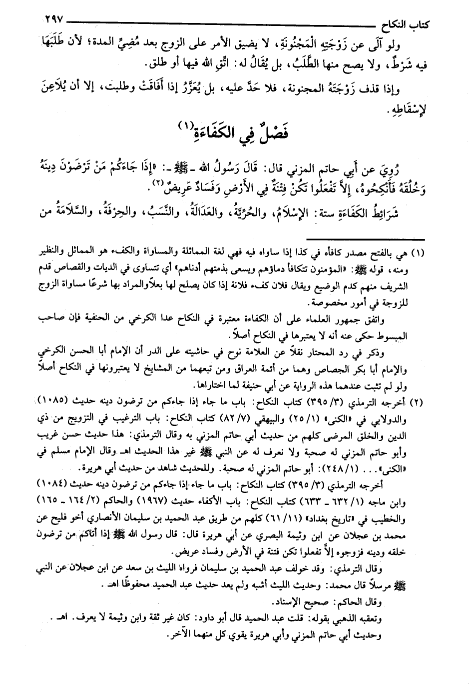 شرائط الكفاءة ستة: الإسلام، والحرية، والعدالة، والنسب، والحرفة، والسلامة من