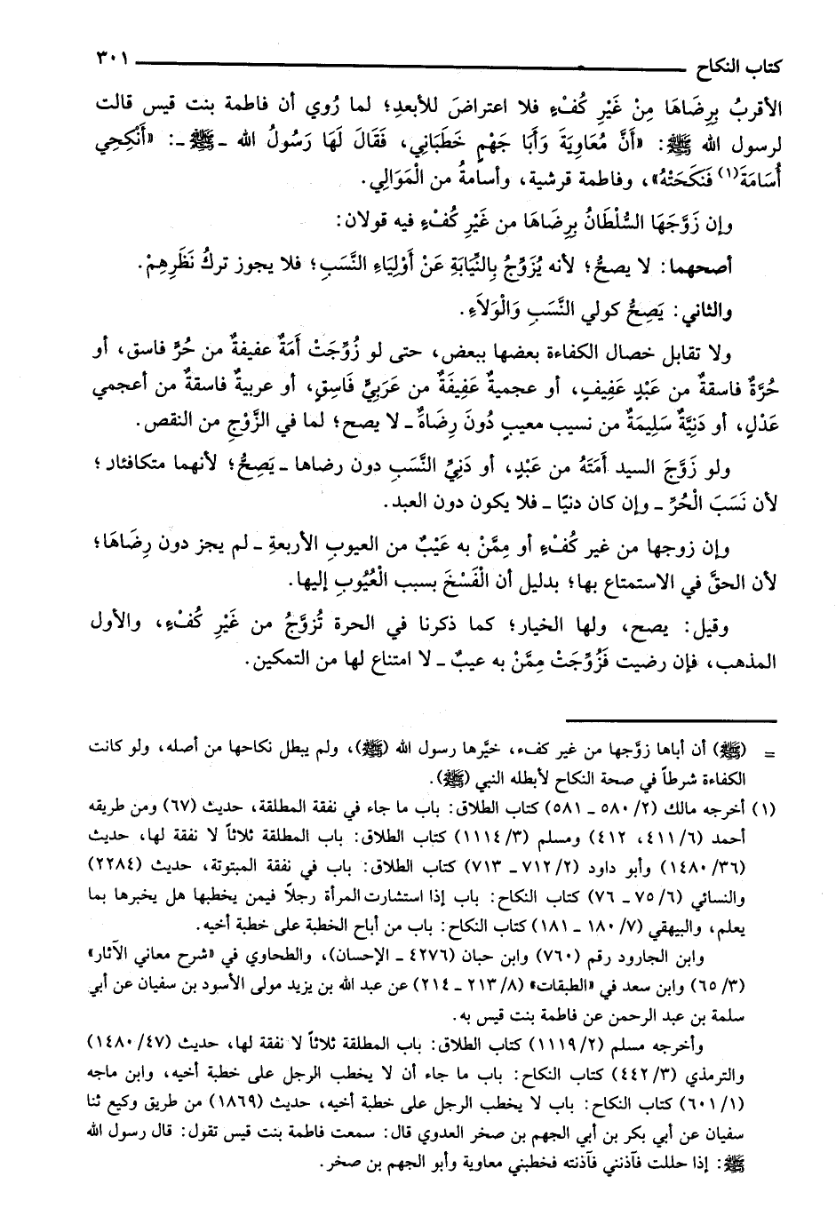 ولا تقابل خصال الكفاءة بعضها ببعض، حتى لو زُوجت أمة عفيفة من حر فاسق، أو حرة فاسقة من عبد عفيف، أو عجمية عفيفة من عربي فاسق، أو عربية فاسقة من أعجمي عدل، أو دنية سليمة من نسيب معيب دون رضاه- لا يصح؛ لما في الزوج من النقص.