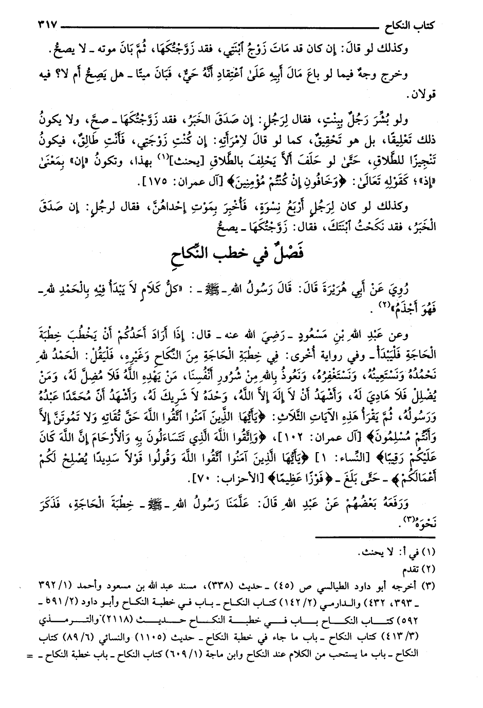 وعن عبد الله بن مسعودٍ- رضي الله عنه - قال إذا أراد أحدكم أن يخطب خطبة الحاجة فليبدأ - وفي رواية أخرى: في خطبة الحاجة من النكاح وغيره، فليقل: الحمد لله نحمده ونستعينه، ونستغفره، ونعوذ بالله من شرور أنفسنا، من يهده الله فلا مضل له، ومن يضلل فلا هادي له، واشهد أن لا إله إلا الله، وحده لا شريك له، وأشهد أن محمداً عبده ورسوله، ثم يقرأ هذه الآيات الثلاث: {يَا أَيُّهَا الَّذِينَ آمَنُوا اتَّقُوا اللَّهَ حَقَّ تُقَاتِهِ وَلا تَمُوتُنَّ إِلاَّ وَأَنْتُمْ مُسْلِمُونَ} [آل عمران: 102]، {وَاتَّقُوا اللَّهَ الَّذِي تَتَسَاءَلُونَ بِهِ وَالأَرْحَامَ إِنَّ اللَّهَ كَانَ عَلَيْكُمْ رَقِيباً} [النساء: 1] {يَا أَيُّهَا الَّذِينَ آمَنُوا اتَّقُوا اللَّهَ وَقُولُوا قَوْلاً سَدِيداً (70) يُصْلِحْ لَكُمْ أَعْمَالَكُمْ} - حتى بلغ - {فَوْزاً عَظِيماً} [الأحزاب: 70].