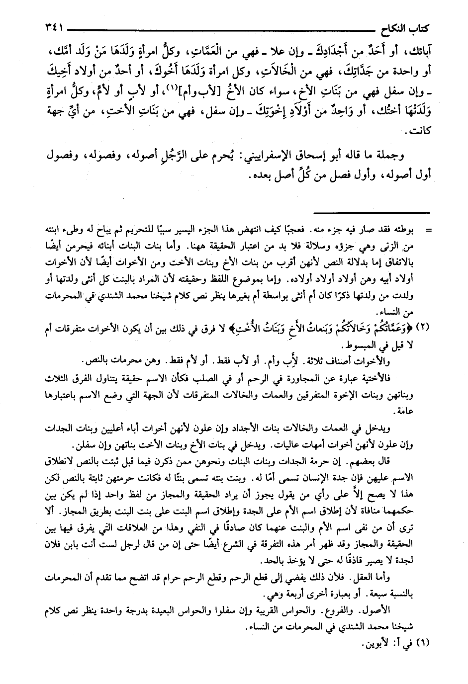 وجملة ما قاله أبو إسحاق الإسفراييني: يُحرم على الرجل أصوله، وفصوله، وفصول أول أصوله، وأول فصل من كل أصل بعده.