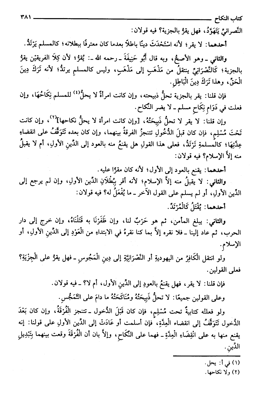 وإن قلنا: لا يقر لا تحل ذبيحته، [وإن كانت امرأة لا يحل نكاحها]، وإن كانت تحت مسلم، فإن كان قبل الدخول تتنجز الفرقة بينهما، وإن كان بعده تتوقف على انقضاء عدتها؛ كالمسلمة ترتد، فعلى هذا القول هل يقنع منه بالعود إلى الدين الأول، أم لا يقبل منه إلا الإسلام؟ فيه قولان:
