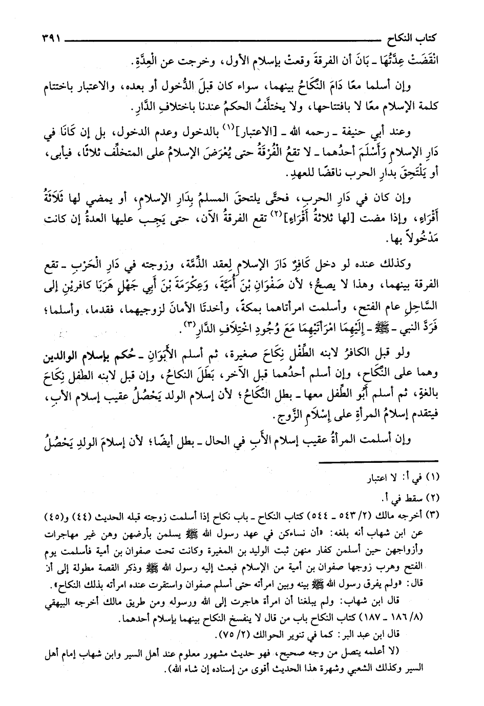 وكذلك عنده لو دخل كافرٌ دار الإسلام لعقد الذمة، وزوجته في دار الحرب - تقع الفرقة بينهما، وهذا لا يصح؛ لأن صفوان بن أمية، وعكرمة بن أبي جهل هربا كافرين إلى الساحل عام الفتح، وأسلمت امرأتاهما بمكة، وأخذتا الأمان لزوجيهما، فقدما، وأسلما؛ فرد النبي - صلى الله عليه وسلم - إليهما امرأتيهما مع وجود اختلاف الدار.