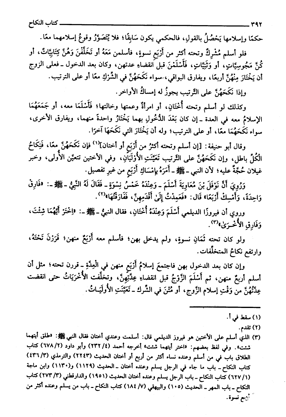 ورُوي أن نوفل بن معاوية أسلم - وعنده خمس نسوة - فقال له النبي - صلى الله عليه وسلم-: "فارق واحدة، وأمسك أربعاً" قال: "فعمدت إلى أقدمهن، ففارقتها".