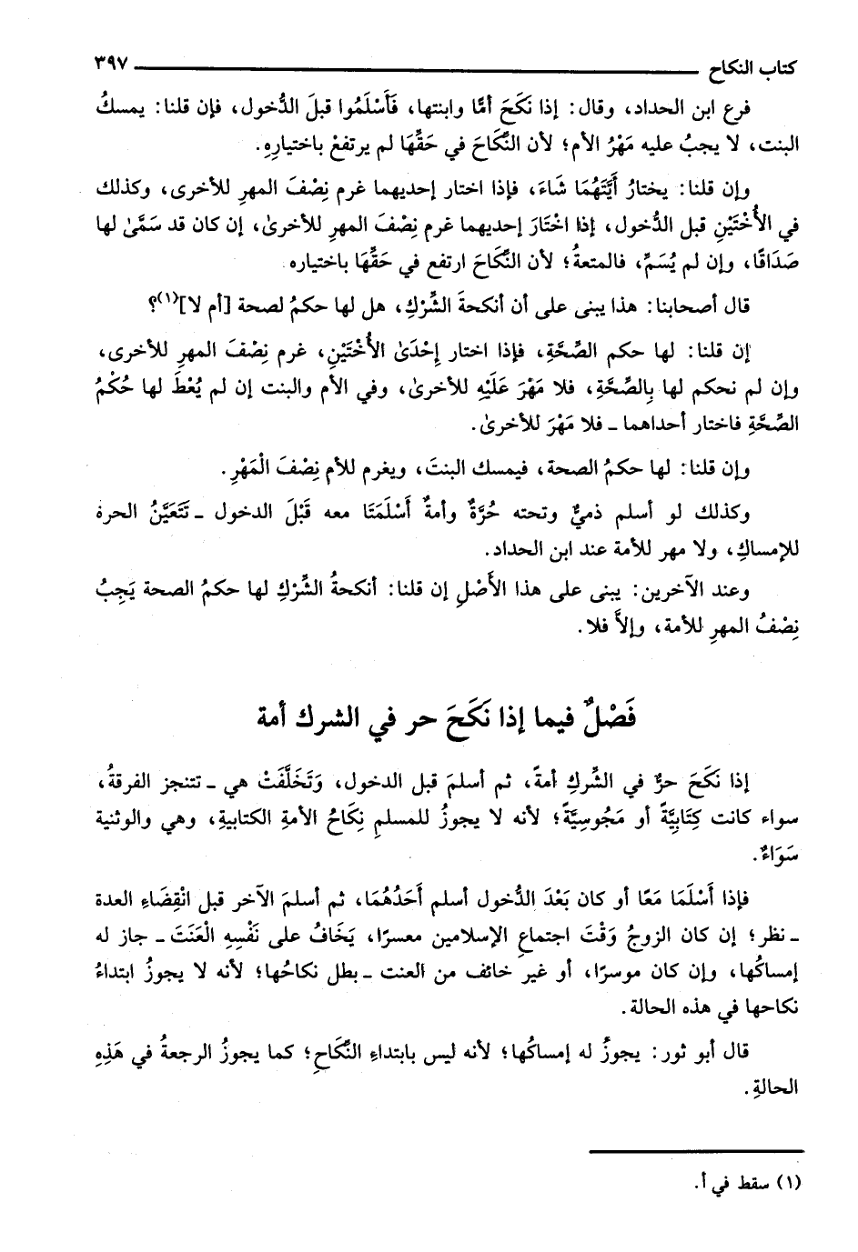 وعند الآخرين: يبنى على هذا الأصل إن قلنا: أنكحة الشرك لها حكم الصحة يجب نصف المهر للأمة، وإلا فلا.