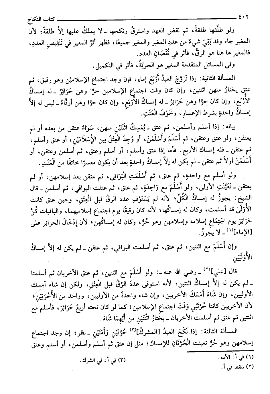 المسألة الثالثة: إذا نكح العبد [المشرك] حرتين وأمتين- نظر؛ إن وجد اجتماع إسلامهن وهو حر تعينت الحرتان للإمساك؛ مثل إن عتق ثم أسلم وأسلمن، أو أسلم وعتق