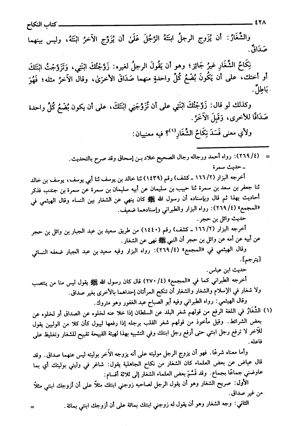 نكاح الشغار غير جائز؛ وهو أن يقول الرجل لغيره: زوجت ابنتي، وتزوجت ابنتك أو أختك، على أن يكون بُضع كل واحدةٍ منهما صداق الأخرى، وقال الآخر مثله؛ فهو باطلٌ.