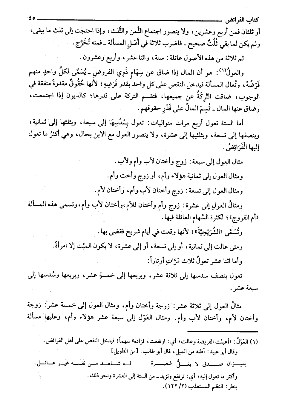 مثالُ العول إلى ثلاثة عشر: زوجة وأختان وأم، ومثال العول إلى خمسة عشر: زوجة وأختان لأم، وأختان لأب وأم. ومثال العول إلى سبعة عشر هؤلاء وأم، وعليها مسألة