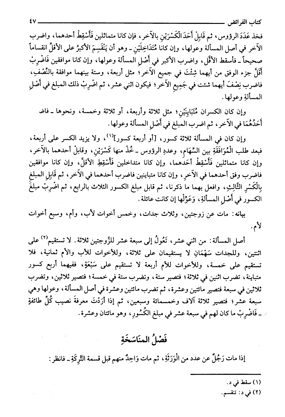 فخذ عدد الرؤوس، ثم قابل أحد الكسرين بالآخر، فإن كانا متماثلين فأسقط أحدهما، واضرب الآخر في أصل المسألة وعولها، وإن كانا متداخلين - وهو أن ينقسم الأكبر على الأقل انقساماً صحيحاً - فأسقط الأقل، واضرب الأكبر في أصل المسألة وعولها، وإن كانا موافقين فاضرب أقل جزء الوفق من أيهما شئت في جميع الآخر؛ مثل أربعة، وستة بينهما موافقة بالنصف، فاضرب نصف أيهما شئت في جميع الآخر؛ فيكون اثني عشر، ثم اضرب ذلك المبلغ في أصل المسألة وعولها.