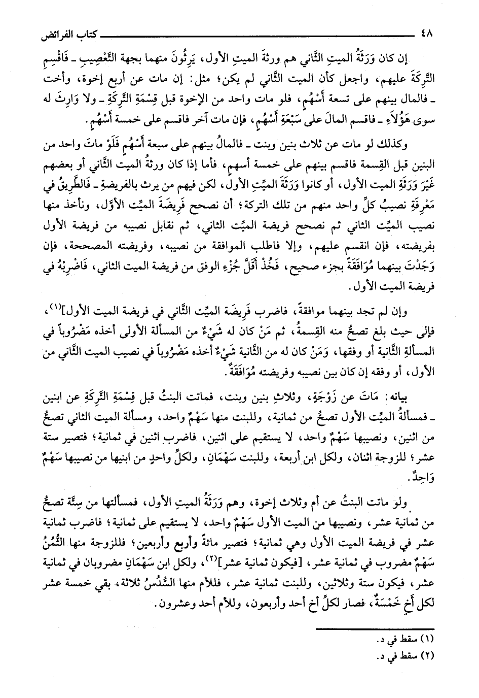 وكذلك لو مات عن ثلاث بنين وبنت - فالمال ينهم على سبعة أسهم فلو مات واحد من البنين قبل القسمة فاقسم بينهم على خمسة أسهم، فأما إذا كان ورثة الميت الثاني أو بعضهم غير ورثة الميت الأول، أو كانوا ورثة الميت الأول، لكن فيهم من يرث بالفريضة - فالطريق في معرفة نصيب كل واحد منهم من تلك التركة؛ أن نصحح فريضة الميت الأول، ونأخذ منها نصيب الميت الثاني ثم نصحح فريضة الميت الثاني، ثم نقابل نصيبه من فريضة الأول بفريضته، فإن انقسم عليهم، وإلا فاطلب الموافقة من نصيبه، وفريضته المصححة، فإن وجدت بينهما موافقة بجزء صحيح، فخذ أقل جزء الوفق من فريضة الميت الثاني، فاضربه في فريضة الميت الأول.