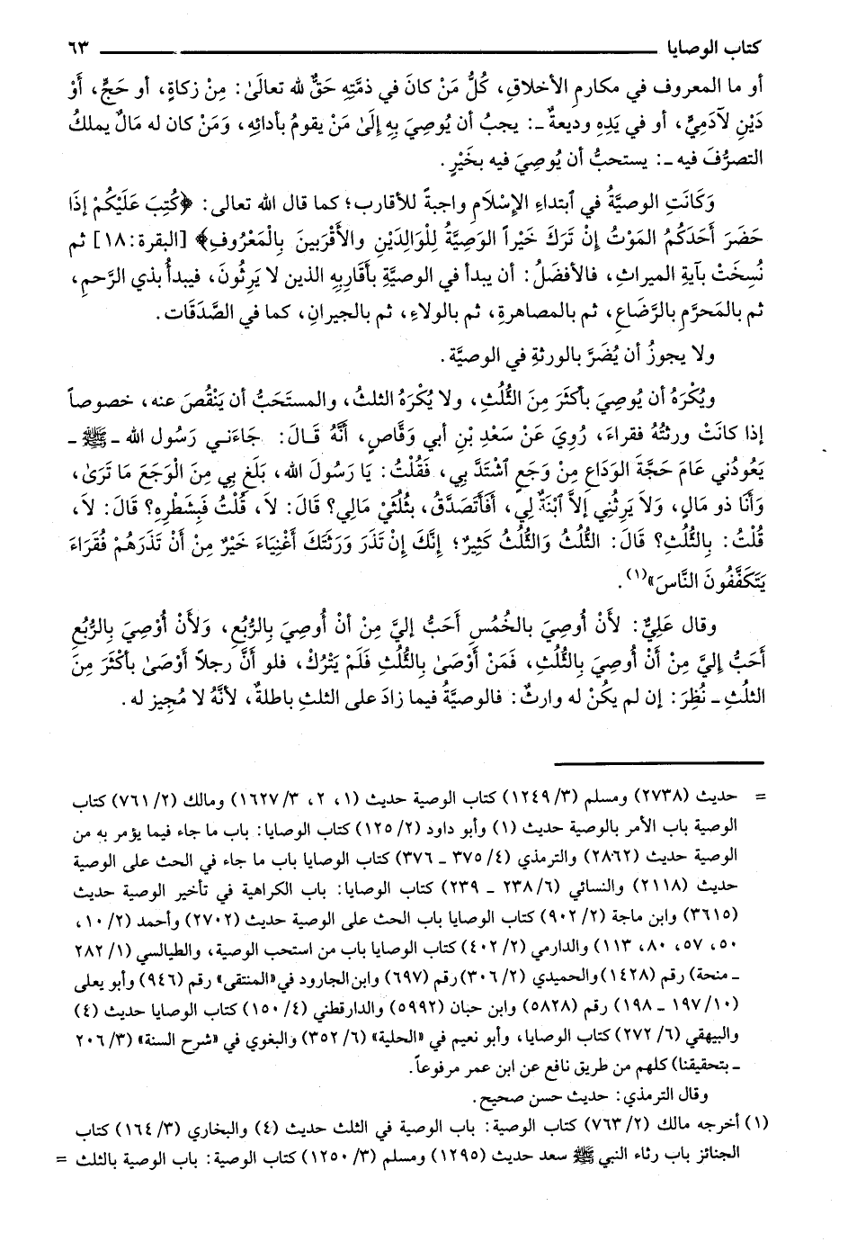 ويُكره أن يُوصي بأكثر من الثلث، ولا يُكره الثلث، والمستحب أن ينقص عنه، خصوصاً إذا كانت ورثته فقراء، رُوي عن سعد بن أبي وقاص، أنه قال جاءني رسول الله - صلى الله عليه وسلم - يعودني عام حجة الوداع من وجع اشتد بي، فقلت: يا رسول الله، بلغ بي من الوجع ما ترى، وأنا ذو مال، ولا يرثني إلا ابنة لي، أفأتصدق، بثلثي مالي؟ قال: لا، قلت فبشطره؟ قال: لا، قلت: بالثلث؟ قال: الثلث والثلث كثير؛ إنك إن تذر ورثتك أغنياء خير من أن تذرهم فقراء يتكففون الناس".