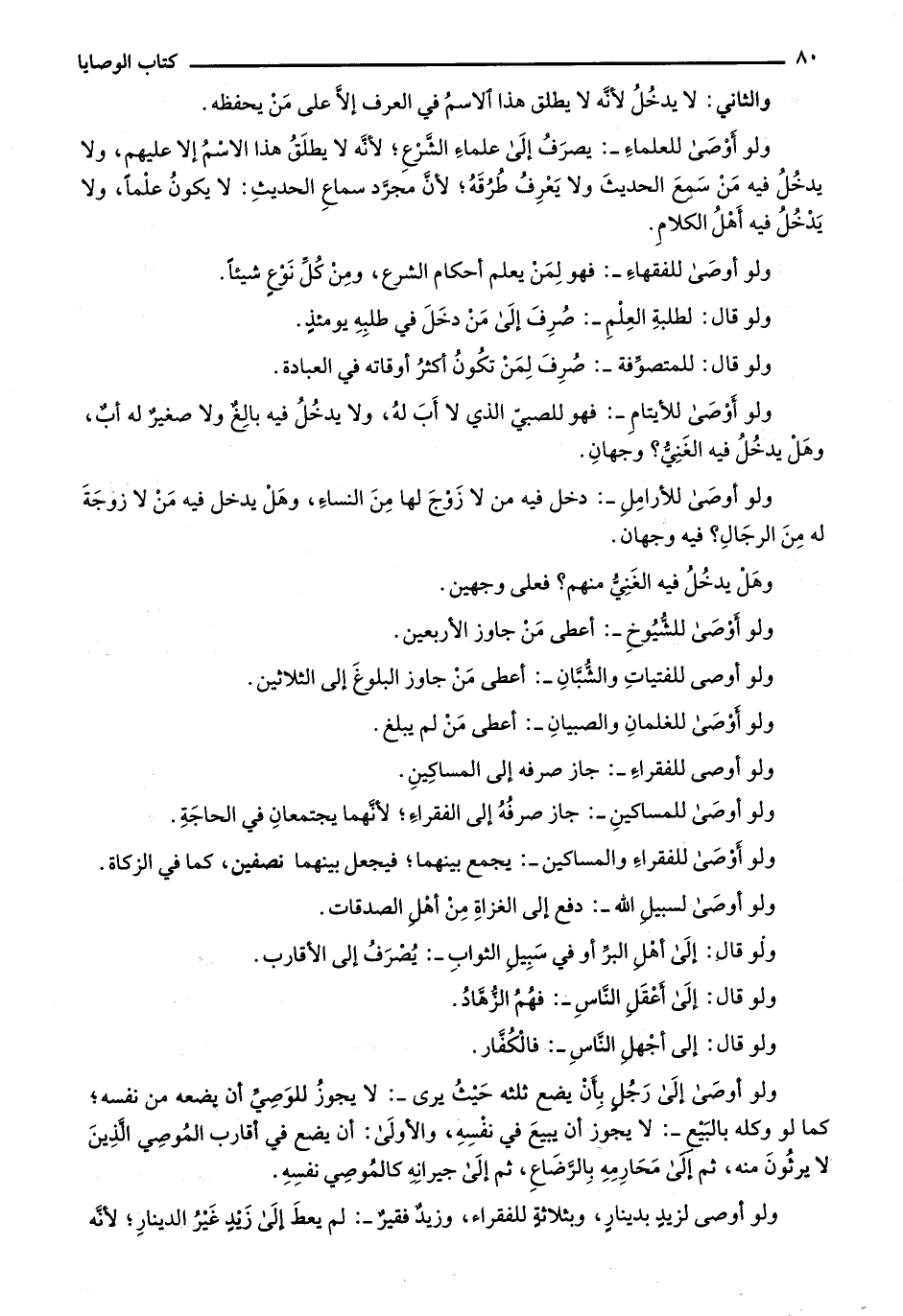ولو أوصى للعلماء-: يصرف إلى علماء الشرع؛ لأنه لا يطلق هذا الاسم إلا عليهم، ولا يدخل فيه من سمع الحديث ولا يعرف طرقه؛ لأن مجرد سماع الحديث: لا يكون علماً، ولا يدخل فيه أهل الكلام.