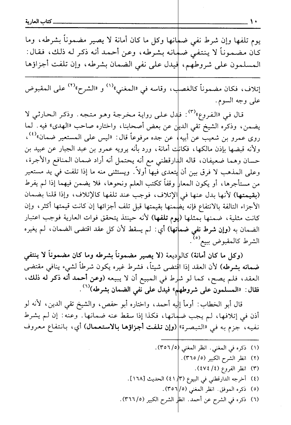 ـــــــــــــــــــــــــــــQإِتْلَافٍ، فَكَانَ مَضْمُونًا كَالْغَصْبِ، وَقَاسَهُ فِي " الْمُغْنِي "، وَ " الشَّرْحِ " عَلَى الْمَقْبُوضِ عَلَى وَجْهِ السَّوْمِ. قَالَ فِي " الْفُرُوعِ ": فَدَلَّ عَلَى رِوَايَةٍ مُخَرَّجَةٍ وَهُوَ مُتَّجِهٌ، وَذَكَرَ الْحَارِثِيُّ لَا يَضْمَنُ، وَذَكَرَهُ الشَّيْخُ تَقِيُّ الدِّينِ عَنْ بَعْضِ أَصْحَابِنَا، وَاخْتَارَهُ صَاحِبُ " الْهَدْيِ " فِيهِ؛ لِمَا رَوَى عَمْرُو بْنُ شُعَيْبٍ عَنْ أَبِيهِ، عَنْ جَدِّهِ مَرْفُوعًا قَالَ: «لَيْسَ عَلَى الْمُسْتَعِيرِ ضَمَانٌ» ، وَلِأَنَّهُ قَبَضَهَا بِإِذْنِ مَالِكِهَا فَكَانَتْ أَمَانَةً، وَرُدَّ بِأَنَّهُ يَرْوِيهِ عَمْرُو بْنُ عَبْدِ الْجَبَّارِ عَنْ عُبَيْدِ بْنِ حَسَّانَ، وَهُمَا ضَعِيفَانِ، قَالَهُ الدَّارَقُطْنِيُّ مَعَ أَنَّهُ يُحْتَمَلُ أَنَّهُ أَرَادَ ضَمَانَ الْمَنَافِعِ وَالْأُجْرَةِ، وَعَلَى الْمَذْهَبِ لَا فَرْقَ بَيْنَ أَنْ يَتَعَدَّى فِيهَا أَوْ لَا، وَيُسْتَثْنَى مِنْهُ مَا إِذَا تَلِفَتْ فِي يَدِ مُسْتَعِيرٍ مِنْ مُسْتَأْجِرِهَا، أَوْ يَكُونُ الْمُعَارُ وَقْفًا كَكُتُبِ الْعِلْمِ وَنَحْوِهَا، فَلَا يَضْمَنُ فِيهِمَا إِذَا لَمْ يُفَرِّطْ (بِقِيمَتِهَا) لِأَنَّهَا بَدَلٌ عَنْهَا فِي الْإِتْلَافِ، فَوَجَبَ عِنْدَ تَلَفِهَا كَالْإِتْلَافِ، وَإِذَا قُلْنَا بِضَمَانِ الْأَجْزَاءِ التَّالِفَةِ بِالِانْتِفَاعِ فَإِنَّهُ يَضْمَنُهَا بِقِيمَتِهَا قَبْلَ تَلَفِ أَجْزَائِهَا إِنْ كَانَتْ قِيمَتُهَا أَكْثَرَ، وَإِنْ كَانَتْ مِثْلِيَّةً ضَمِنَهَا بِمِثْلِهَا (يَوْمَ تَلَفِهَا) ؛ لِأَنَّهُ حِينَئِذٍ يَتَحَقَّقُ فَوَاتُ الْعَارِيَةِ فَوَجَبَ اعْتِبَارُ الضَّمَانِ بِهِ