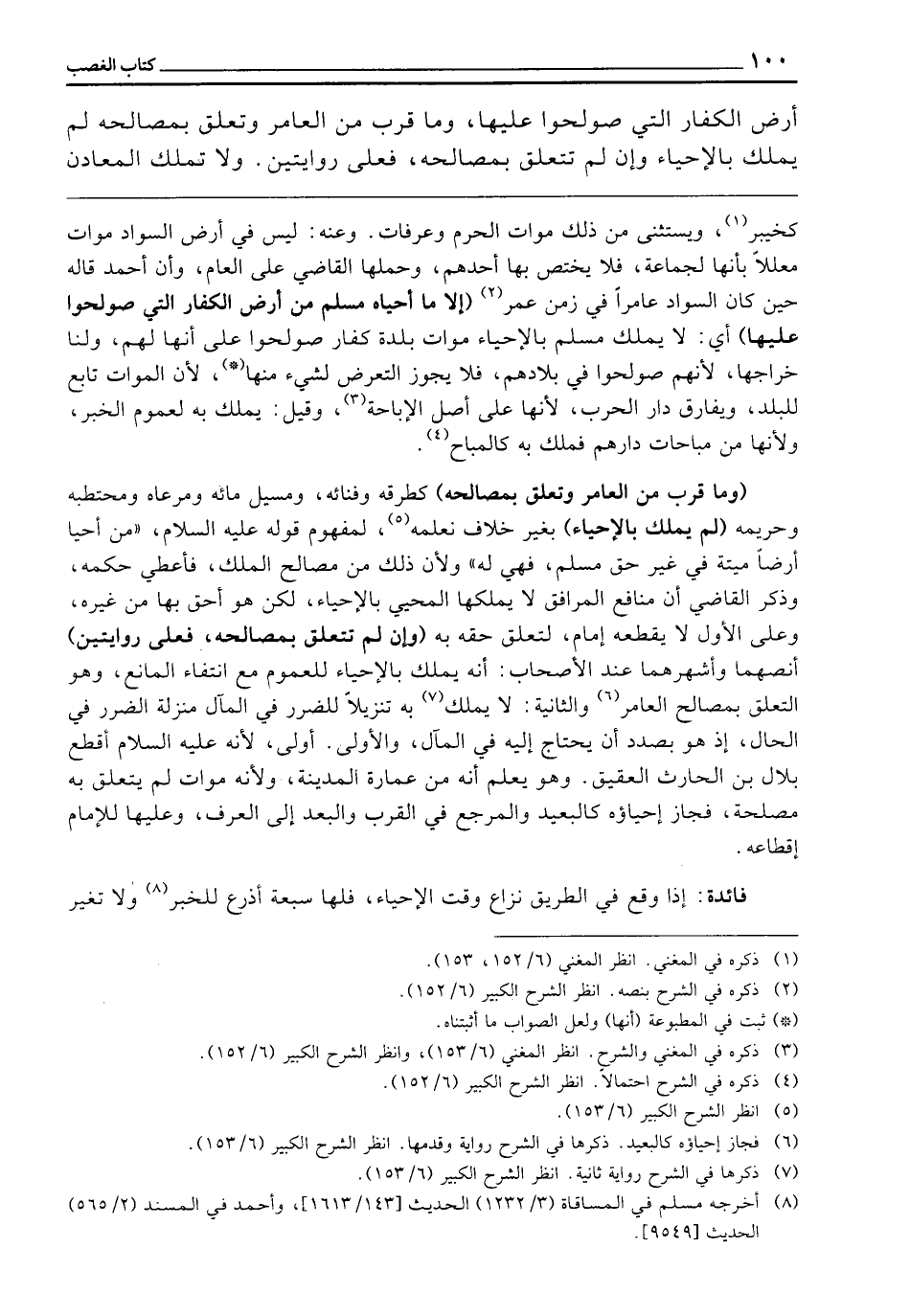 ـــــــــــــــــــــــــــــQكَخَيْبَرَ، وَيُسْتَثْنَى مِنْ ذَلِكَ مَوَاتُ الْحَرَمِ وَعَرَفَاتٍ، وَعَنْهُ: لَيْسَ فِي أَرْضِ السَّوَادِ مَوَاتٌ مُعَلِّلًا بِأَنَّهَا لِجَمَاعَةٍ، فَلَا يُخْتَصُّ بِهَا أَحَدُهُمْ، وَحَمَلَهَا الْقَاضِي عَلَى الْعَامِّ، وَأَنَّ أَحْمَدَ قَالَهُ حِينَ كَانَ السَّوَادُ عَامِرًا فِي زَمَنِ عُمَرَ (إِلَّا مَا أَحْيَاهُ مُسْلِمٌ مِنْ أَرْضِ الْكُفَّارِ الَّتِي صُولِحُوا عَلَيْهَا) أَيْ: لَا يَمْلِكُ مُسْلِمٌ بِالْإِحْيَاءِ مَوَاتَ بَلْدَةِ كُفَّارٍ صُولِحُوا عَلَى أَنَّهَا لَهُمْ، وَلَنَا خَرَاجُهَا؛ لِأَنَّهُمْ صُولِحُوا فِي بِلَادِهِمْ فَلَا يَجُوزُ التَّعَرُّضُ لِشَيْءٍ مِنْهَا؛ لِأَنَّ الْمَوَاتَ تَابِعٌ لِلْبَلَدِ، وَيُفَارِقُ دَارَ الْحَرْبِ؛ لِأَنَّهَا عَلَى أَصْلِ الْإِبَاحَةِ، وَقِيلَ: يَمْلِكُ بِهِ لِعُمُومِ الْخَبَرِ، وَلِأَنَّهَا مِنْ مُبَاحَاتِ دَارِهِمْ، فَمَلَكَ بِهِ كَالْمُبَاحِ.
