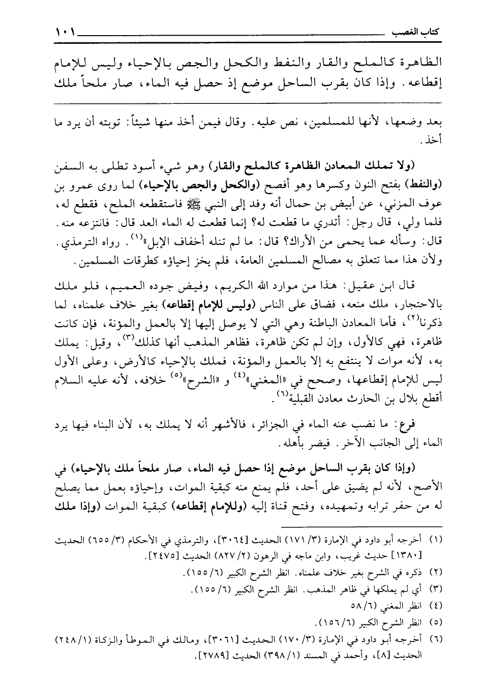 الظَّاهِرَةُ كَالْمِلْحِ وَالْقَارِ وَالنِّفْطِ وَالْكُحْلِ وَالْجِصِّ بِالْإِحْيَاءِ، وَلَيْسَ لِلْإِمَامِ إِقْطَاعُهُ، وَإِذَا كَانَ بِقُرْبِ السَّاحِلِ مَوْضِعٌ إِذَا حَصَلَ فِيهِ الْمَاءُ صَارَ مِلْحًا مُلِكَ