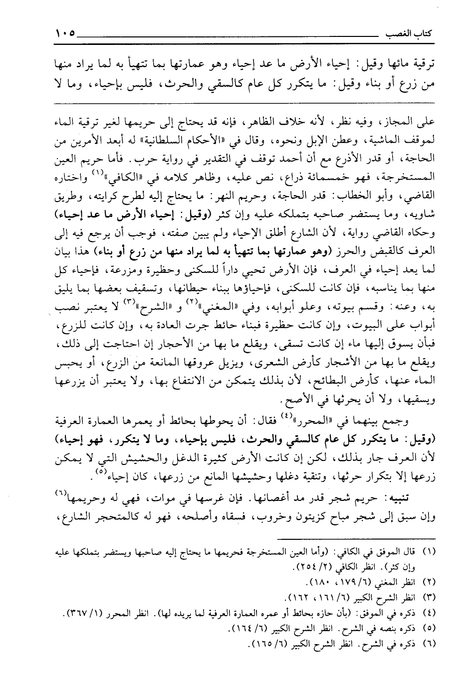 ـــــــــــــــــــــــــــــQعَلَى الْمَجَازِ، وَفِيهِ نَظَرٌ؛ لِأَنَّهُ خِلَافُ الظَّاهِرِ، فَإِنْهُ قَدْ يُحْتَاجُ إِلَى حَرِيمِهَا لِغَيْرِ تَرْقِيَةِ الْمَاءِ لِمَوْقِفِ الْمَاشِيَةِ وَعَطَنِ الْإِبِلِ وَنَحْوِهِ، وَقَالَ فِي " الْأَحْكَامِ السُّلْطَانِيَّةِ " لَهُ أَبْعَدُ الْأَمْرَيْنِ مِنَ الْحَاجَةِ، أَوْ قَدْرُ الْأَذْرُعِ، مَعَ أَنَّ أَحْمَدَ تَوَقَّفَ فِي التَّقْدِيرِ فِي رِوَايَةِ حَرْبٍ، فَأَمَّا حَرِيمُ الْعَيْنِ الْمُسْتَخْرَجَةِ فَهُوَ خَمْسُمِائَةِ ذِرَاعٍ، نَصَّ عَلَيْهِ، وَظَاهِرُ كَلَامِهِ فِي " الْكَافِي " وَاخْتَارَهُ الْقَاضِي وَأَبُو الْخَطَّابِ قَدْرُ الْحَاجَةِ، وَحَرِيمُ النَّهْرِ: مَا يُحْتَاجُ إِلَيْهِ لِطَرْحِ كِرَايَتِهِ، وَطَرِيقِ شَاوِيهِ، وَمَا يَسْتَضِرُّ صَاحِبُهُ بِتَمَلُّكِهِ عَلَيْهِ وَإِنْ كَثُرَ (وَقِيلَ: إِحْيَاءُ الْأَرْضِ مَا عُدَّ إِحْيَاءً) وَحَكَاهُ الْقَاضِي رِوَايَةً؛ لِأَنَّ الشَّارِعَ أَطْلَقَ الْإِحْيَاءَ وَلَمْ يُبَيِّنْ صِفَتَهُ، فَوَجَبَ أَنْ يَرْجِعَ فِيهِ إِلَى الْعُرْفِ كَالْقَبْضِ وَالْحِرْزِ (وَهُوَ عِمَارَتُهَا بِمَا تَتَهَيَّأُ بِهِ لِمَا يُرَادُ مِنْهَا مِنْ زَرْعٍ أَوْ بِنَاءٍ) هَذَا بَيَانٌ لِمَا يُعَدُّ إِحْيَاءً فِي الْعُرْفِ، فَإِنَّ الْأَرْضَ تُحْيَى دَارًا لِلسُّكْنَى، وَحَظِيرَةً، وَمَزْرَعَةً، فَإِحْيَاءُ كُلٍّ مِنْهَا بِمَا يُنَاسِبُهُ، فَإِنْ كَانَتْ لِلسُّكْنَى، فَإِحْيَاؤُهَا بِبِنَاءِ حِيطَانِهَا، وَتَسْقِيفِ بَعْضِهَا بِمَا يَلِيقُ بِهِ، وَعَنْهُ: وَقَسْمُ بُيُوتِهِ، وَعُلُوُّ أَبْوَابِهِ، وَفِي " الْمُغْنِي "، وَ " الشَّرْحِ " لَا يُعْتَبَرُ نَصْبُ أَبْوَابٍ عَلَى الْبُيُوتِ، وَإِنْ كَانَتْ حَظِيرَةً فَبِنَاءُ حَائِطٍ جَرَتِ الْعَادَةُ بِهِ، وَإِنْ كَانَتْ لِلزَّرْعِ فَبِأَنْ يَسُوقَ إِلَيْهَا مَاءً إِنْ كَانَتْ تُسْقَى، وَيَقْلَعَ مَا بِهَا مِنَ الْأَحْجَارِ إِنِ احْتَاجَتْ إِلَى ذَلِكَ، وَيَقْلَعَ مَا بِهَا مِنَ الْأَشْجَارِ كَأَرْضِ الشِّعْرَى، وَيُزِيلَ عُرُوقَهَا الْمَانِعَةَ مِنَ الزَّرْعِ، أَوْ يَحْبِسَ الْمَاءَ عَنْهَا كَأَرْضِ الْبَطَائِحِ؛ لِأَنَّ بِذَلِكَ يَتَمَكَّنُ مِنَ الِانْتِفَاعِ بِهَا، وَلَا يُعْتَبَرُ أَنْ يَزْرَعَهَا، وَيَسْقِيَهَا، وَلَا أَنْ يَحْرُثَهَا فِي الْأَصَحِّ.