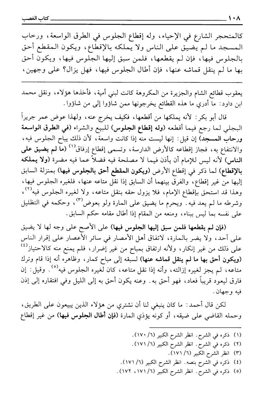 (فَإِنْ لَمْ يَقْطَعْهَا فَلِمَنْ سَبَقَ إِلَيْهَا الْجُلُوسُ فِيهَا) عَلَى الْأَصَحِّ عَلَى وَجْهٍ لَهَا لَا يُضَيِّقُ عَلَى أَحَدٍ، وَلَا يَضُرُّ بِالْمَارَّةِ لِاتِّفَاقِ أَهْلِ الْأَمْصَارِ فِي سَائِرِ الْأَعْصَارِ عَلَى إِقْرَارِ النَّاسِ عَلَى ذَلِكَ مِنْ غَيْرِ إِنْكَارٍ، وَلِأَنَّهُ ارْتِفَاقٌ بِمُبَاحٍ مِنْ غَيْرِ إِضْرَارٍ فَلَمْ يُمْنَعْ مِنْهُ كَالِاحْتِيَازِ (وَيَكُونُ أَحَقَّ بِهَا مَا لَمْ يَنْقُلْ قُمَاشَهُ عَنْهَا) لِسَبْقِهِ إِلَى مُبَاحٍ كَمَارٍّ، وَظَاهِرُهُ أَنَّهُ إِذَا قَامَ وَتَرَكَ مَتَاعَهُ لَمْ يَجُزْ لِغَيْرِهِ إِزَالَتُهُ، وَأَنَّهُ إِذَا نَقَلَ مَتَاعَهُ كَانَ لِغَيْرِهِ الْجُلُوسُ فِيهِ، وَقِيلَ: إِنْ فَارَقَ لِيَعُودَ قَرِيبًا فَعَادَ فَهُوَ أَحَقُّ بِهِ، وَعَنْهُ: يَكُونُ أَحَقَّ بِهِ إِلَى اللَّيْلِ، وَفِي افْتِقَارِهِ إِلَى إِذْنٍ، فِيهِ وَجْهَانِ، لَكِنْ قَالَ أَحْمَدُ: مَا كَانَ يَنْبَغِي لَنَا أَنْ نَشْتَرِيَ مِنْ هَؤُلَاءِ الَّذِينَ يَبِيعُونَ عَلَى الطَّرِيقِ، وَحَمَلَهُ الْقَاضِي عَلَى ضِيقِهِ، أَوْ كَوْنِهِ يُؤْذِي الْمَارَّةَ (فَإِنْ أَطَالَ الْجُلُوسَ فِيهَا) مِنْ غَيْرِ إِقْطَاعٍ