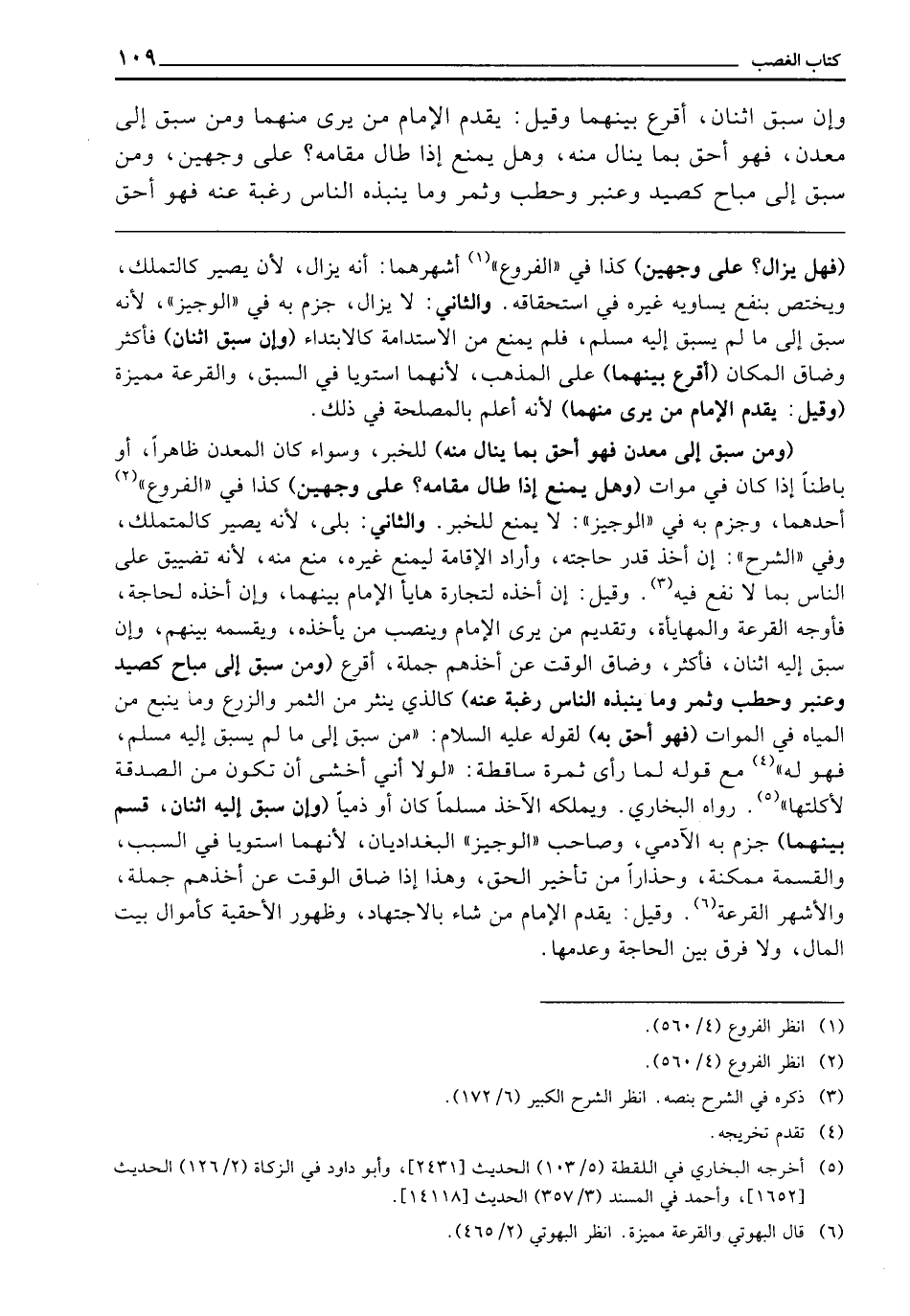 (وَمَنْ سَبَقَ إِلَى مَعْدِنٍ فَهُوَ أَحَقُّ بِمَا يَنَالُ مِنْهُ) لِلْخَبَرِ، وَسَوَاءٌ كَانَ الْمَعْدِنُ ظَاهِرًا أَوْ بَاطِنًا إِذَا كَانَ فِي مَوَاتٍ (وَهَلْ يُمْنَعُ إِذَا طَالَ مُقَامُهُ؛ عَلَى وَجْهَيْنِ) كَذَا فِي " الْفُرُوعِ " أَحَدُهُمَا، وَجُزِمَ بِهِ فِي " الْوَجِيزِ " لَا يُمْنَعُ لِلْخَبَرِ، وَالثَّانِي: بَلَى؛ لِأَنَّهُ يَصِيرُ كَالْمُتَمَلِّكِ، وَفِي " الشَّرْحِ " إِنْ أَخَذَ قَدْرَ حَاجَتِهِ، وَأَرَادَ الْإِقَامَةَ لِيَمْنَعَ غَيْرَهُ، مُنِعَ مِنْهُ؛ لِأَنَّهُ تَضْيِيقٌ عَلَى النَّاسِ بِمَا لَا نَفْعَ فِيهِ، وَقِيلَ: إِنْ أَخَذَهُ لِتِجَارَةٍ هَايَأَ الْإِمَامُ بَيْنَهُمَا، وَإِنْ أَخَذَهُ لِحَاجَةٍ، فَأَوْجُهُ الْقُرْعَةِ وَالْمُهَايَأَةِ، وَتَقْدِيمِ مَنْ يَرَى الْإِمَامُ، وَيَنْصِبُ مَنْ يَأْخُذُهُ، وَيُقَسِّمُهُ بَيْنَهُمْ، وَإِنْ سَبَقَ إِلَيْهِ اثْنَانِ فَأَكْثَرُ وَضَاقَ الْوَقْتُ عَنْ أَخْذِهِمْ جُمْلَةً أَقْرَعَ (وَمَنْ سَبَقَ إِلَى مُبَاحٍ كَصَيْدٍ، وَعَنْبَرٍ، وَحَطَبٍ، وَثَمَرٍ، وَمَا يَنْبُذُهُ النَّاسُ رَغْبَةً عَنْهُ) كَالَّذِي يُنْثَرُ مِنَ الثَّمَرِ وَالزَّرْعِ، وَمَا يَنْبُعُ مِنَ الْمِيَاهِ فِي الْمَوَاتِ (فَهُوَ أَحَقُّ بِهِ) لِقَوْلِهِ - عَلَيْهِ السَّلَامُ -: «مَنْ سَبَقَ إِلَى مَا لَمْ يَسْبِقْ إِلَيْهِ مُسْلِمٌ فَهُوَ لَهُ» ، مَعَ قَوْلِهِ لَمَّا رَأَىَ ثَمَرَةً سَاقِطَةً: " «لَوْلَا أَنِّي أَخْشَى أَنْ تَكُونَ مِنَ الصَّدَقَةِ لِأَكَلْتُهَا» . رَوَاهُ الْبُخَارِيُّ، وَيَمْلِكُهُ الْآخِذُ مُسْلِمًا كَانَ أَوْ ذِمِّيًّا (وَإِنْ سَبَقَ إِلَيْهِ اثْنَانِ قُسِمَ بَيْنَهُمَا) جَزَمَ بِهِ الْآدَمِيُّ، وَصَاحِبُ " الْوَجِيزِ " الْبَغْدَادِيَّانِ، لِأَنَّهُمَا اسْتَوَيَا فِي السَّبَبِ، وَالْقِسْمَةُ مُمْكِنَةٌ، وَحِذَارًا مِنْ تَأْخِيرِ الْحَقِّ، وَهَذَا إِذَا ضَاقَ الْوَقْتُ عَنْ أَخْذِهِمْ جُمْلَةً، وَالْأَشْهَرُ الْقُرْعَةُ، وَقِيلَ: يُقَدِّمُ الْإِمَامُ مَنْ شَاءَ بِالِاجْتِهَادِ وَظُهُورِ الْأَحَقِّيَّةِ كَأَمْوَالِ بَيْتِ الْمَالِ، وَلَا فَرْقَ بَيْنَ الْحَاجَةِ وَعَدَمِهَا.