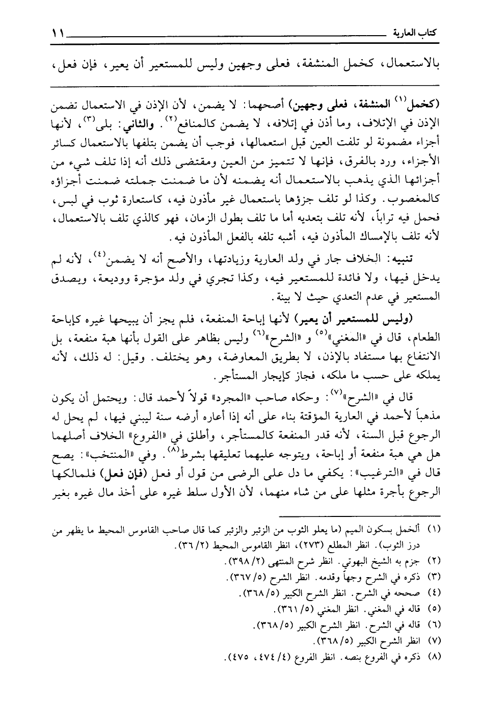 ـــــــــــــــــــــــــــــQ (كَخَمْلِ الْمِنْشَفَةِ، فَعَلَى وَجْهَيْنِ) أَصَحُّهُمَا لَا يَضْمَنُ؛ لِأَنَّ الْإِذْنَ فِي الِاسْتِعْمَالِ تَضْمَنُ الْإِذْنَ فِي الْإِتْلَافِ، وَمَا أُذِنَ فِي إِتْلَافِهِ لَا يُضْمَنُ كَالْمَنَافِعِ، وَالثَّانِي: بَلَى؛ لِأَنَّهَا أَجْزَاءٌ مَضْمُونَةٌ، لَوْ تَلِفَتِ الْعَيْنُ قَبْلَ اسْتِعْمَالِهَا، فَوَجَبَ أَنْ يُضْمَنَ بِتَلَفِهَا بِالِاسْتِعْمَالِ كَسَائِرِ الْأَجْزَاءِ، وَرُدَّ بِالْفَرْقِ، فَإِنَّهَا لَا تَتَمَيَّزُ مِنَ الْعَيْنِ، وَمُقْتَضَى ذَلِكَ أَنَّهُ إِذَا تَلِفَ شَيْءٌ مِنْ أَجْزَائِهَا الَّذِي لَا يَذْهَبُ بِالِاسْتِعْمَالِ أَنَّهُ يَضْمَنُهُ؛ لِأَنَّ مَا ضُمِنَتْ جُمْلَتُهُ ضُمِنَتْ أَجْزَاؤُهُ كَالْمَغْصُوبِ، وَكَذَا لَوْ تَلِفَ جُزْؤُهَا بِاسْتِعْمَالٍ غَيْرِ مَأْذُونٍ فِيهِ، كَاسْتِعَارَةِ ثَوْبٍ فِي لُبْسٍ، فَحَمَلَ فِيهِ تُرَابًا؛ لِأَنَّهُ تَلِفَ بِتَعَدِّيِهِ، أَمَّا مَا تَلِفَ بِطُولِ الزَّمَانِ فَهُوَ كَالَّذِي تَلِفَ بِالِاسْتِعْمَالِ؛ لِأَنَّهُ تَلِفَ بِالْإِمْسَاكِ الْمَأْذُونِ فِيهِ، أَشْبَهَ تَلَفُهُ بِالْفِعْلِ الْمَأْذُونِ فِيهِ.