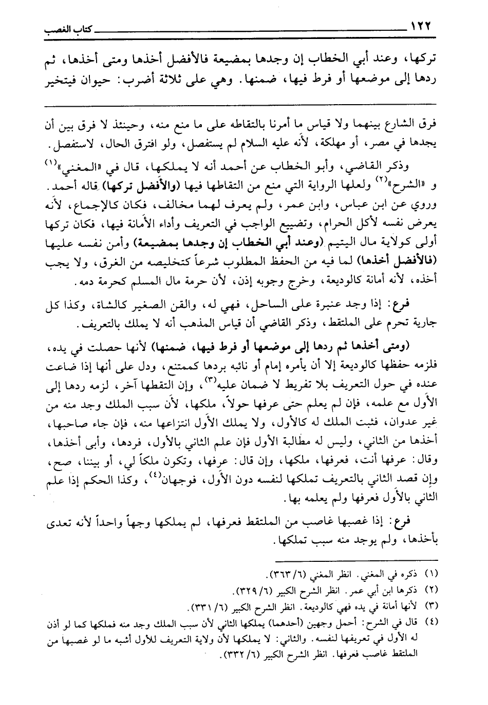 تَرْكُهَا، وَعِنْدَ أَبِي الْخَطَّابِ: إِنْ وَجَدَهَا بِمَضْيَعَةٍ فَالْأَفْضَلُ أَخْذُهَا، وَمَتَى أَخَذَهَا ثُمَّ رَدَّهَا إِلَى مَوْضِعِهَا أَوْ فَرَّطَ فِيهَا ضَمِنَهَا.