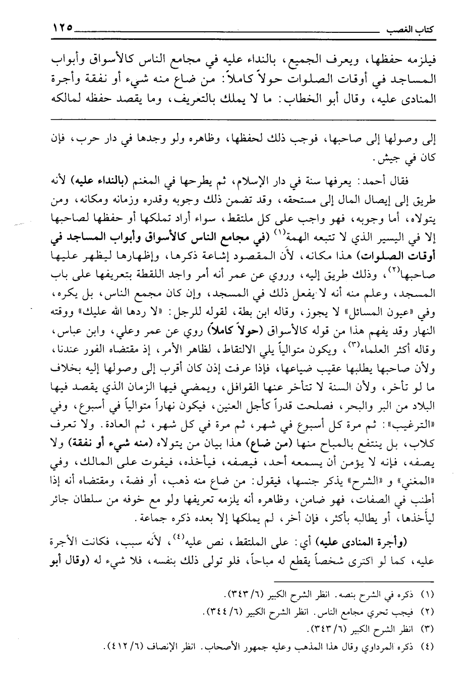 فَقَالَ أَحْمَدُ: يُعَرِّفُهَا سَنَةً فِي دَارِ الْإِسْلَامِ، ثُمَّ يَطْرَحُهَا فِي الْمَغْنَمِ (بِالنِّدَاءِ عَلَيْهِ) لِأَنَّهُ طَرِيقٌ إِلَى إِيصَالِ الْمَالِ إِلَى مُسْتَحِقِّهِ، وَقَدْ تَضَمَّنَ ذَلِكَ وُجُوبَهُ، وَقَدْرَهُ، وَزَمَانَهُ، وَمَكَانَهُ، وَمَنْ يَتَوَلَّاهُ، أَمَّا وُجُوبُهُ فَهُوَ وَاجِبٌ عَلَى كُلِّ مُلْتَقِطٍ، سَوَاءٌ أَرَادَ تَمَلُّكَهَا أَوْ حِفْظَهَا لِصَاحِبِهَا، إِلَّا فِي الْيَسِيرِ الَّذِي لَا تَتْبَعُهُ الْهِمَّةُ (فِي مَجَامِعِ النَّاسِ كَالْأَسْوَاقِ، وَأَبْوَابِ الْمَسَاجِدِ فِي أَوْقَاتِ الصَّلَوَاتِ) هَذَا مَكَانُهُ؛ لِأَنَّ الْمَقْصُودَ إِشَاعَةُ ذِكْرِهَا وَإِظْهَارُهَا لِيَظْهَرَ عَلَيْهَا صَاحِبُهَا، وَذَلِكَ طَرِيقٌ إِلَيْهِ، وَرُوِيَ عَنْ عُمَرَ أَنَّهُ أَمَرَ وَاجِدَ اللُّقَطَةِ بِتَعْرِيفِهَا عَلَى بَابِ الْمَسْجِدِ، وَعُلِمَ مِنْهُ أَنَّهُ لَا يُفْعَلُ ذَلِكَ فِي الْمَسْجِدِ، وَإِنْ كَانَ مَجْمَعَ النَّاسِ، بَلْ يُكْرَهُ، وَفِي " عُيُونِ الْمَسَائِلِ " لَا يَجُوزُ، وَقَالَهُ ابْنُ بَطَّةَ لِقَوْلِهِ لِلرَّجُلِ: لَا رَدَّهَا اللَّهُ عَلَيْكَ، وَوَقْتُهُ النَّهَارُ، وَقَدْ يُفْهَمُ هَذَا مِنْ قَوْلِهِ كَالْأَسْوَاقِ (حَوْلًا كَامِلًا) رُوِيَ عَنْ عُمَرَ، وَعَلِيٍّ، وَابْنِ عَبَّاسٍ، وَقَالَهُ أَكْثَرُ الْعُلَمَاءِ، وَيَكُونُ مُتَوَالِيًا يَلِي الِالْتِقَاطَ لِظَاهِرِ الْأَمْرِ، إِذْ مُقْتَضَاهُ الْفَوْرُ عِنْدَنَا، وَلِأَنَّ صَاحِبَهَا يَطْلُبُهَا عَقِيبَ ضَيَاعِهَا، فَإِذَا عُرِّفَتْ إِذَنْ، كَانَ أَقْرَبَ إِلَى وُصُولِهَا إِلَيْهِ، بِخِلَافِ مَا لَوْ تَأَخَّرَ، وَلِأَنَّ السَّنَةَ لَا تَتَأَخَّرُ عَنْهَا الْقَوَافِلُ، وَيَمْضِي فِيهَا الزَّمَانُ الَّذِي يُقْصَدُ فِيهَا الْبِلَادُ مِنَ الْبَرِّ وَالْبَحْرِ، فَصَلُحَتْ قَدْرًا كَأَجَلِ الْعِنِّينِ، فَيَكُونُ نَهَارًا مُتَوَالِيًا فِي أُسْبُوعٍ، وَفِي " التَّرْغِيبِ " ثُمَّ مَرَّةً كُلَّ أُسْبُوعٍ فِي شَهْرٍ، ثُمَّ مَرَّةً فِي كُلِّ شَهْرٍ، ثُمَّ الْعَادَةُ، وَلَا تُعَرَّفُ كِلَابٌ بَلْ يُنْتَفَعُ بِالْمُبَاحِ مِنْهَا (مَنْ ضَاعَ) هَذَا بَيَانُ مَنْ يَتَوَلَّاهُ (مِنْهُ شَيْءٌ أَوْ نَفَقَةٌ) وَلَا يَصِفُهُ، فَإِنْهُ لَا يُؤْمَنُ أَنْ يَسْمَعَهُ أَحَدٌ فَيَصِفَهُ فَيَأْخُذَهُ فَيَفُوتَ عَلَى الْمَالِكِ، وَفِي " الْمُغْنِي " وَ " الشَّرْحِ " يَذْكُرُ جِنْسَهَا فَيَقُولُ: مَنْ ضَاعَ مِنْهُ ذَهَبٌ أَوْ فِضَّةٌ، وَمُقْتَضَاهُ أَنَّهُ إِذَا أَطْنَبَ فِي الصِّفَاتِ فَهُوَ ضَامِنٌ، وَظَاهِرُهُ أَنَّهُ يَلْزَمُهُ تَعْرِيفُهَا، وَلَوْ مَعَ خَوْفِهِ مِنْ سُلْطَانٍ جَائِرٍ لِيَأْخُذَهَا، أَوْ يُطَالِبَهُ بِأَكْثَرَ، فَإِنْ أَخَّرَ لَمْ يَمْلِكْهَا إِلَّا بَعْدَهُ، ذَكَرَهُ جَمَاعَةٌ.