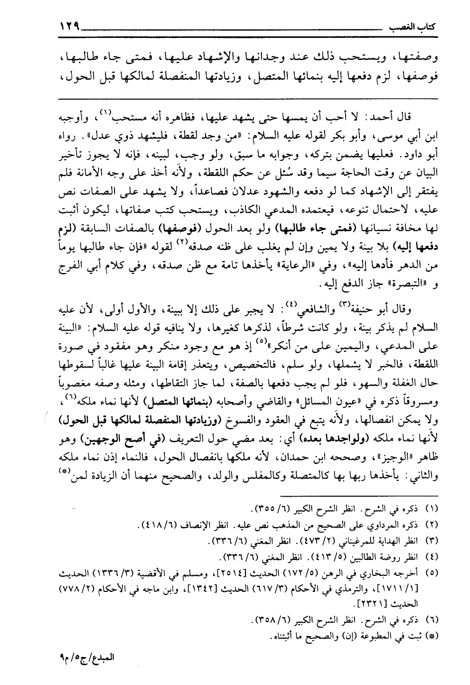 وَقَالَ أَبُو حَنِيفَةَ وَالشَّافِعِيُّ: لَا يُجْبَرُ عَلَى ذَلِكَ إِلَّا بِبَيِّنَةٍ، وَالْأَوَّلُ أَوْلَى؛ لِأَنَّهُ - عَلَيْهِ السَّلَامُ - لَمْ يَذْكُرْ بَيِّنَةً، وَلَوْ كَانَتْ شَرْطًا لَذَكَرَهَا كَغَيْرِهَا، وَلَا يُنَافِيهِ قَوْلُهُ - عَلَيْهِ السَّلَامُ -: «الْبَيِّنَةُ عَلَى الْمُدَّعِي وَالْيَمِينُ عَلَى مَنْ أَنْكَرَ» إِذْ هُوَ مَعَ وُجُودِ مُنْكِرٍ، وَهُوَ مَفْقُودٌ فِي صُورَةِ اللُّقَطَةِ فَالْخَبَرُ لَا يَشْمَلُهَا، وَلَوْ سَلَّمَ فَالتَّخْصِيصُ، وَيَتَعَذَّرُ إِقَامَةُ الْبَيِّنَةِ عَلَيْهَا غَالِبًا لِسُقُوطِهَا حَالَ الْغَفْلَةِ وَالسَّهْوِ، فَلَوْ لَمْ يَجِبْ دَفْعُهَا بِالصِّفَةِ لَمَا جَازَ الْتِقَاطُهَا، وَمِثْلُهُ وَصْفُهُ مَغْصُوبًا وَمَسْرُوقًا، ذَكَرَهُ فِي " عُيُونِ الْمَسَائِلِ " وَالْقَاضِي وَأَصْحَابُهُ (بِنَمَائِهَا الْمُتَّصِلِ) لِأَنَّهَا نَمَاءُ مِلْكِهِ، وَلَا يُمْكِنُ انْفِصَالُهَا، وَلِأَنَّهُ يُتْبَعُ فِي الْعُقُودِ وَالْفُسُوخِ (وَزِيَادَتُهَا الْمُنْفَصِلَةُ لِمَالِكِهَا قَبْلَ الْحَوْلِ) لِأَنَّهَا نَمَاءُ مِلْكِهِ (وَلِوَاجِدِهَا بَعْدَهُ) أَيْ: بَعْدَ مُضِيِّ حَوْلِ التَّعْرِيفِ (فِي أَصَحِّ الْوَجْهَيْنِ) وَهُوَ ظَاهِرُ " الْوَجِيزِ " وَصَحَّحَهُ ابْنُ حَمْدَانَ؛ لِأَنَّهُ مَلَكَهَا بِانْفِصَالِ الْحَوْلِ، فَالنَّمَاءُ إِذَنْ نَمَاءُ مِلْكِهِ، وَالثَّانِي: يَأْخُذُهَا رَبُّهَا بِهَا كَالْمُتَّصِلَةِ، وَكَالْمُفْلِسِ، وَالْوَلَدِ، وَالصَّحِيحُ مِنْهُمَا أَنَّ الزِّيَادَةَ لِمَنْ