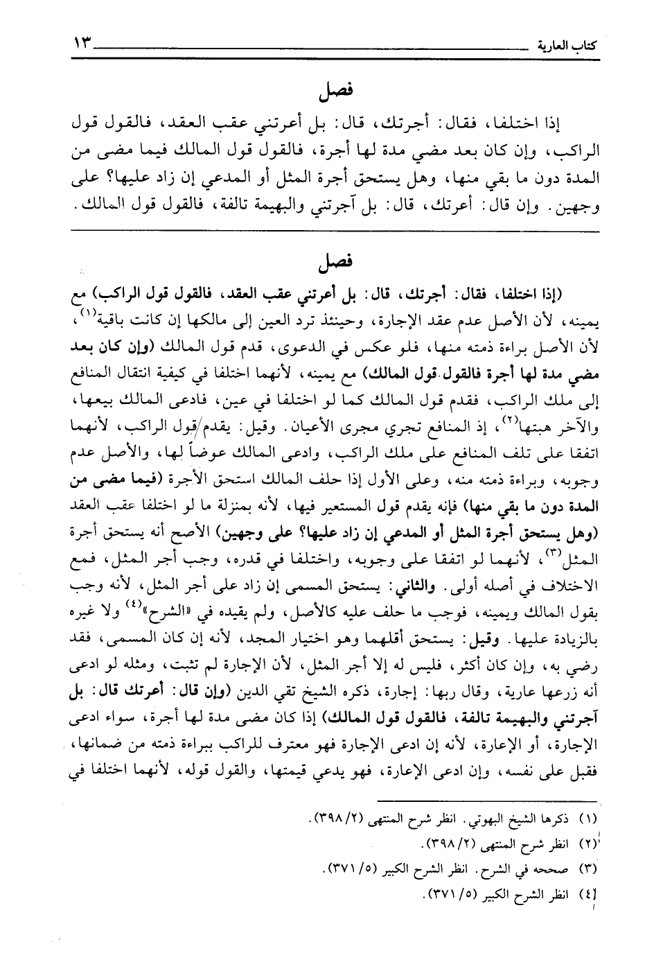 فَصْلٌ إِذَا اخْتَلَفَا فَقَالَ: أَجَّرْتُكَ، قَالَ: بَلْ أَعَرْتَنِي عَقِبَ الْعَقْدِ، فَالْقَوْلُ قَوْلُ الرَّاكِبِ، وَإِنْ كَانَ بَعْدَ مُضِيِّ مُدَّةٍ لَهَا أُجْرَةٌ فَالْقَوْلُ قَوْلُ الْمَالِكِ فِيمَا مَضَى مِنَ الْمُدَّةِ دُونَ مَا بَقِيَ مِنْهَا، وَهَلْ يَسْتَحِقُّ أُجْرَةَ الْمِثْلِ أَوِ الْمُدَّعِي إِنْ زَادَ عَلَيْهَا؟ عَلَى وَجْهَيْنِ. وَإِنْ قَالَ: أَعَرْتُكَ، قَالَ: بَلْ آجَرْتَنِي، وَالْبَهِيمَةُ تَالِفَةٌ، فَالْقَوْلُ قَوْلُ الْمَالِكِ.