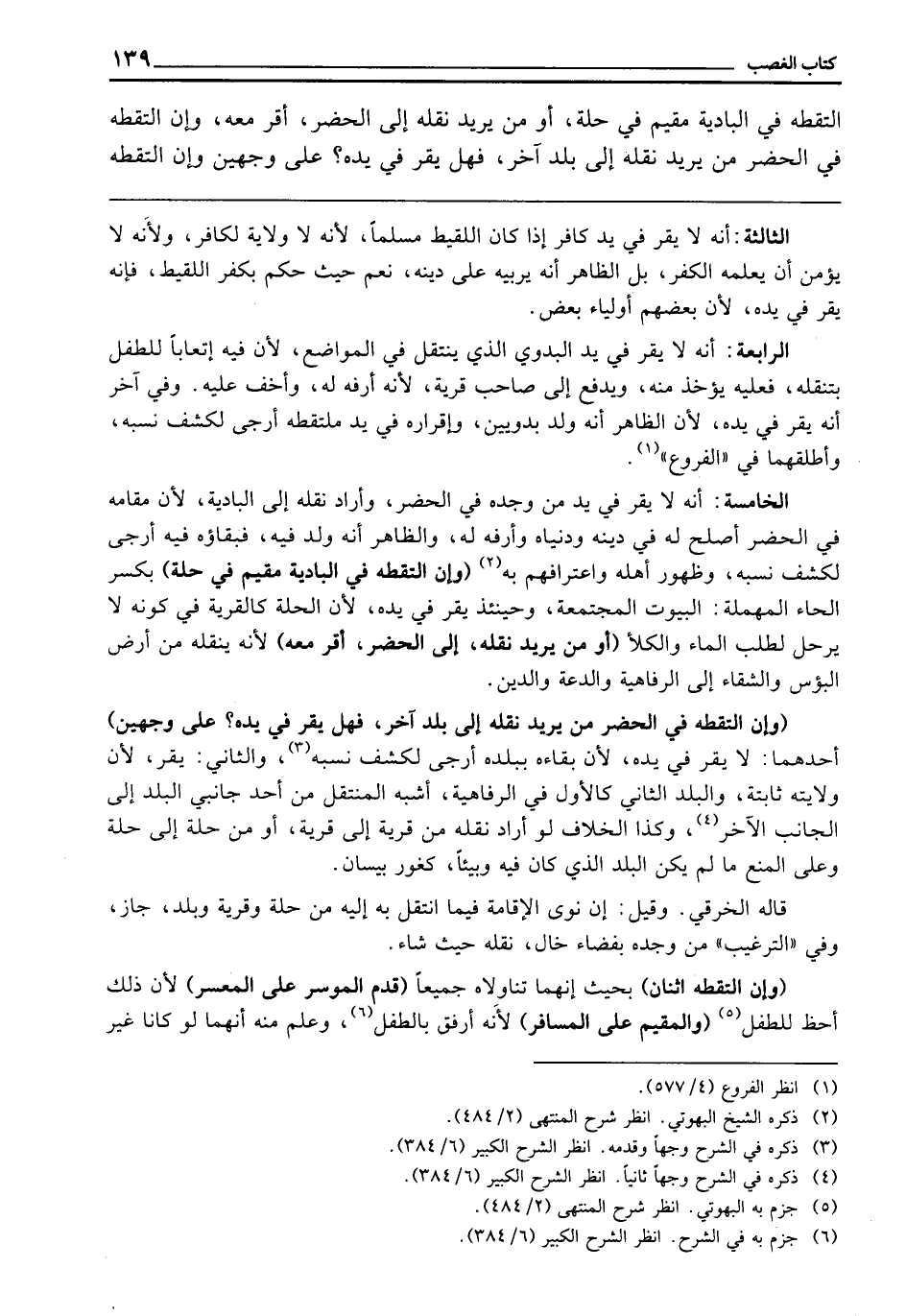 الرَّابِعَةُ: أَنَّهُ لَا يُقَرُّ فِي يَدِ الْبَدَوِيِّ الَّذِي يَنْتَقِلُ فِي الْمَوَاضِعِ؛ لِأَنَّ فِيهِ إِتْعَابًا لِلطِّفْلِ بِتَنَقُّلِهِ، فَعَلَيْهِ يُؤْخَذُ مِنْهُ وَيُدْفَعُ إِلَى صَاحِبِ قَرْيَةٍ؛ لِأَنَّهُ أَرْفَهُ لَهُ، وَأَخَفُّ عَلَيْهِ، وَفِي آخَرَ أَنَّهُ يُقَرُّ فِي يَدِهِ؛ لِأَنَّ الظَّاهِرَ أَنَّهُ وَلَدُ بَدَوِيَّيْنِ، وَإِقْرَارُهُ فِي يَدِ مُلْتَقِطِهِ أَرْجَى لِكَشْفِ نَسَبِهِ، وَأَطْلَقَهُمَا فِي " الْفُرُوعِ ".