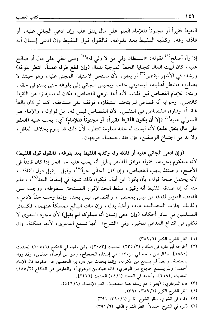 اللَّقِيطُ فَقِيرًا أَوْ مَجْنُونًا فَلِلْإِمَامِ الْعَفْوُ عَلَى مَالٍ يُنْفَقُ عَلَيْهِ، وَإِنِ ادَّعَى الْجَانِي عَلَيْهِ أَوْ قَاذِفُهُ رِقَّهُ وَكَذَّبَهُ اللَّقِيطُ بَعْدَ بُلُوغِهِ فَالْقَوْلُ قَوْلُ اللَّقِيطِ، وَإِنِ ادَّعَى إِنْسَانٌ أَنَّهُ