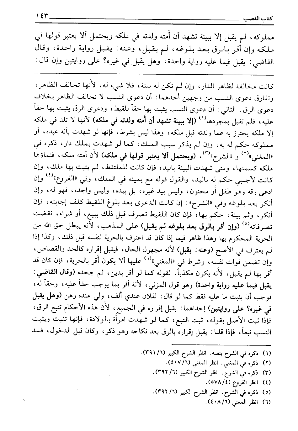 ـــــــــــــــــــــــــــــQكَانَتْ مُخَالِفَةً لِظَاهِرِ الدَّارِ، وَإِنْ لَمْ تَكُنْ لَهُ بَيِّنَةٌ فَلَا شَيْءَ لَهُ؛ لِأَنَّهَا تُخَالِفُ الظَّاهِرَ، وَتُفَارِقُ دَعْوَى النَّسَبِ مِنْ وَجْهَيْنِ، أَحَدُهُمَا: أَنَّ دَعْوَى النَّسَبِ لَا تُخَالِفُ الظَّاهِرَ بِخِلَافِ دَعْوَى الرِّقِّ، الثَّانِي: أَنَّ دَعْوَى النَّسَبِ يَثْبُتُ بِهَا حَقًّا لِلَّقِيطِ، وَدَعْوَى الرِّقِّ يُثْبِتُ بِهَا حَقًّا عَلَيْهِ، فَلَمْ تُقْبَلْ بِمُجَرَّدِهَا (إِلَّا بِبَيِّنَةٍ تَشْهَدُ أَنَّ أَمَتَهُ وَلَدَتْهُ فِي مِلْكِهِ) ؛ لِأَنَّهَا لَا تَلِدُ فِي مِلْكِهِ إِلَّا مِلْكَهُ، يُحْتَرَزُ بِهِ عَمَّا وَلَدَتْهُ قَبْلَ مِلْكِهِ، وَهَذَا لَيْسَ بِشَرْطٍ، فَإِنَّهَا لَوْ شَهِدَتْ بِأَنَّهُ عَبْدُهُ أَوْ مَمْلُوكُهُ حُكِمَ لَهُ بِهِ، وَإِنْ لَمْ يُذْكَرْ سَبَبُ الْمِلْكِ كَمَا لَوْ شَهِدَتْ بِمِلْكِ دَارٍ، ذَكَرَهُ فِي " الْمُغْنِي " وَ " الشَّرْحِ " (وَيَحْتَمِلُ أَلَّا يُعْتَبَرَ قَوْلُهَا فِي مِلْكِهِ) ؛ لِأَنَّ أَمَتَهُ مِلْكُهُ، فَنَمَاؤُهَا مِلْكُهُ كَسِمَنِهَا، وَمَتَى شَهِدَتِ الْبَيِّنَةُ بِالْيَدِ فَإِنْ كَانَتْ لِلْمُلْتَقِطِ لَمْ يَثْبُتْ بِهَا مِلْكٌ، وَإِنْ كَانَتْ لِأَجْنَبِيٍّ حُكِمَ لَهُ بِالْيَدِ، وَالْقَوْلُ قَوْلُهُ مَعَ يَمِينِهِ فِي الْمِلْكِ، وَفِي " الْفُرُوعِ ": وَإِنِ ادَّعَى رِقَّهُ وَهُوَ طِفْلٌ، أَوْ مَجْنُونٌ، وَلَيْسَ بِيَدِ غَيْرِهِ بَلْ بِيَدِهِ، وَلَيْسَ وَاجِدُهُ - فَهُوَ لَهُ وَإِنْ أَنْكَرَ بَعْدَ بُلُوغِهِ، وَفِي " الشَّرْحِ ": إِنْ كَانَتِ الدَّعْوَى بَعْدَ بُلُوغِ اللَّقِيطِ كُلِّفَ إِجَابَتَهُ، فَإِنْ أَنْكَرَ وَثَمَّ بَيِّنَةٌ حُكِمَ بِهَا، فَإِنْ كَانَ اللَّقِيطُ تَصَرَّفَ قَبْلَ ذَلِكَ بِبَيْعٍ أَوْ شِرَاءٍ نُقِضَتْ تَصَرُّفَاتُهُ، (وَإِنْ أَقَرَّ بِالرِّقِّ بَعْدَ بُلُوغِهِ لَمْ يُقْبَلْ) عَلَى الْمَذْهَبِ؛ لِأَنَّهُ يُبْطِلُ حَقَّ اللَّهِ مِنَ الْحُرِّيَّةِ الْمَحْكُومِ بِهَا، وَهَذَا ظَاهِرٌ فِيمَا إِذَا كَانَ قَدِ اعْتَرَفَ بِالْحُرِّيَّةِ لِنَفْسِهِ قَبْلَ ذَلِكَ، وَكَذَا إِذَا لَمْ يَعْتَرِفْ فِي الْأَصَحِّ، (وَعَنْهُ: يُقْبَلُ) ؛ لِأَنَّهُ مَجْهُولُ الْحَالِ، فَيُقْبَلُ إِقْرَارُهُ كَالْحَدِّ وَالْقِصَاصِ، وَإِنْ تَضَمَّنَ فَوَاتَ نَفْسِهِ، وَشَرَطَ فِي " الْمُغْنِي " عَلَيْهَا أَلَّا يَكُونَ أَقَرَّ بِالْحُرِّيَّةِ، فَإِنْ كَانَ قَدْ أَقَرَّ بِهَا لَمْ يُقْبَلْ؛ لِأَنَّهُ يَكُونُ مُكَذِّبًا لِقَوْلِهِ كَمَا لَوْ أَقَرَّ بِدَيْنٍ ثُمَّ جَحَدَهُ. (وَقَالَ الْقَاضِي: يُقْبَلُ فِيمَا عَلَيْهِ رِوَايَةً وَاحِدَةً) ، وَهُوَ قَوْلُ الْمُزَنِيِّ؛ لِأَنَّهُ أَقَرَّ بِمَا يُوجِبُ حَقًّا عَلَيْهِ وَحَقًّا لَهُ، فَوَجَبَ أَنْ يُثْبِتَ مَا عَلَيْهِ فَقَطْ، كَمَا لَوْ قَالَ: لِفُلَانٍ عِنْدِي أَلْفٌ وَلِي عِنْدَهُ رَهْنٌ، (وَهَلْ يُقْبَلُ فِي غَيْرِهِ؟ عَلَى رِوَايَتَيْنِ) ، إِحْدَاهُمَا يُقْبَلُ إِقْرَارُهُ فِي الْجَمِيعِ؛ لِأَنَّ هَذِهِ الْأَحْكَامَ تَتْبَعُ الرِّقَّ، فَإِذَا ثَبَتَ الْأَصْلُ بِقَوْلِهِ، ثَبَتَ التَّبَعُ، كَمَا لَوْ شَهِدَتِ امْرَأَةٌ بِالْوِلَادَةِ، فَإِنَّهَا تَثْبُتُ وَيَثْبُتُ النَّسَبُ تَبَعًا، فَإِذَا قُلْنَا يُقْبَلُ إِقْرَارُهُ بِالرِّقِّ بَعْدَ نِكَاحِهِ وَهُوَ ذَكَرٌ، وَكَانَ قَبْلَ الدُّخُولِ - فَسَدَ