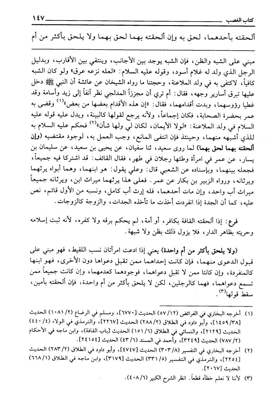 ـــــــــــــــــــــــــــــQمَبْنِيٌّ عَلَى الشَّبَهِ وَالظَّنِّ، فَإِنَّ الشَّبَهَ يُوجَدُ بَيْنَ الْأَجَانِبِ وَيَنْتَفِي بَيْنَ الْأَقَارِبِ، وَبِدَلِيلِ الرَّجُلِ الَّذِي وُلِدَ لَهُ غُلَامٌ أَسْوَدُ، وَقَوْلُهُ - عَلَيْهِ السَّلَامُ -: «لَعَلَّهُ نَزَعَهُ عِرْقٌ» وَلَوْ كَانَ الشَّبَهُ كَافِيًا لَاكْتَفَى بِهِ فِي وَلَدِ الْمُلَاعَنَةِ، وَحُجَّتُنَا مَا رَوَاهُ الشَّيْخَانِ «عَنْ عَائِشَةَ أَنَّ النَّبِيَّ - صَلَّى اللَّهُ عَلَيْهِ وَسَلَّمَ - دَخَلَ عَلَيْهَا تَبْرُقُ أَسَارِيرُ وَجْهِهِ، فَقَالَ: أَلَمْ تَرَيْ أَنَّ مُجَزِّزًا الْمُدْلِجِيَّ نَظَرَ آنِفًا إِلَى زَيْدٍ وَأُسَامَةَ، وَقَدْ غَطَّيَا رُءُوسَهُمَا وَبَدَتْ أَقْدَامُهُمَا، فَقَالَ: إِنَّ هَذِهِ الْأَقْدَامَ بَعْضُهَا مِنْ بَعْضٍ» . وَقَضَى بِهِ عُمَرُ بِحَضْرَةِ الصَّحَابَةِ، فَكَانَ إِجْمَاعًا؛ وَلِأَنَّهُ يُرْجَعُ لِقَوْلِهَا كَالْبَيِّنَةِ، وَيَدُلُّ عَلَيْهِ قَوْلُهُ - عَلَيْهِ السَّلَامُ - فِي وَلَدِ الْمُلَاعَنَةِ: «لَوْلَا الْأَيْمَانُ لَكَانَ لِي وَلَهَا شَأْنٌ» . فَحَكَمَ - عَلَيْهِ السَّلَامُ - بِهِ لِلَّذِي أَشْبَهَهُ مِنْهُمَا، وَحِينَئِذٍ فَإِنِ انْتَفَى الْمَانِعُ وَجَبَ الْعَمَلُ بِهِ؛ لِوُجُودِ مُقْتَضِيهِ، (وَإِنْ أَلْحَقَتْهُ بِهِمَا لَحِقَ بِهِمَا) ؛ لِمَا رَوَى سَعِيدٌ ثَنَا سُفْيَانُ، عَنْ يَحْيَى بْنِ سَعِيدٍ، عَنْ سُلَيْمَانَ بْنِ يَسَارٍ، عَنْ عُمَرَ، فِي امْرَأَةٍ وَطِئَهَا رَجُلَانِ فِي طُهْرٍ، فَقَالَ الْقَائِفُ: قَدِ اشْتَرَكَا فِيهِ جَمِيعًا، فَجَعَلَهُ بَيْنَهُمَا، وَبِإِسْنَادِهِ عَنِ الشَّعْبِيِّ قَالَ: وَعَلِيٌّ يَقُولُ: هُوَ ابْنُهُمَا، وَهُمَا أَبَوَاهُ يَرِثُهُمَا وَيَرِثَانِهِ. وَرَوَاهُ الزُّبَيْرُ بْنُ بَكَّارٍ عَنْ عُمَرَ، فَعَلَى هَذَا يَرِثُهُمَا مِيرَاثَ ابْنٍ، وَيَرِثَانِهِ جَمِيعًا مِيرَاثَ أَبٍ وَاحِدٍ، وَإِنْ مَاتَ أَحَدُهُمَا فَلَهُ إِرْثُ أَبٍ كَامِلٍ، وَنَسَبُهُ مِنَ الْأَوَّلِ قَائِمٌ، نَصَّ عَلَيْهِ، كَمَا أَنَّ الْجَدَّةَ إِذَا انْفَرَدَتْ، أَخَذَتْ مَا تَأْخُذُهُ الْجَدَّاتُ، وَالزَّوْجَةُ كَالزَّوْجَاتِ.