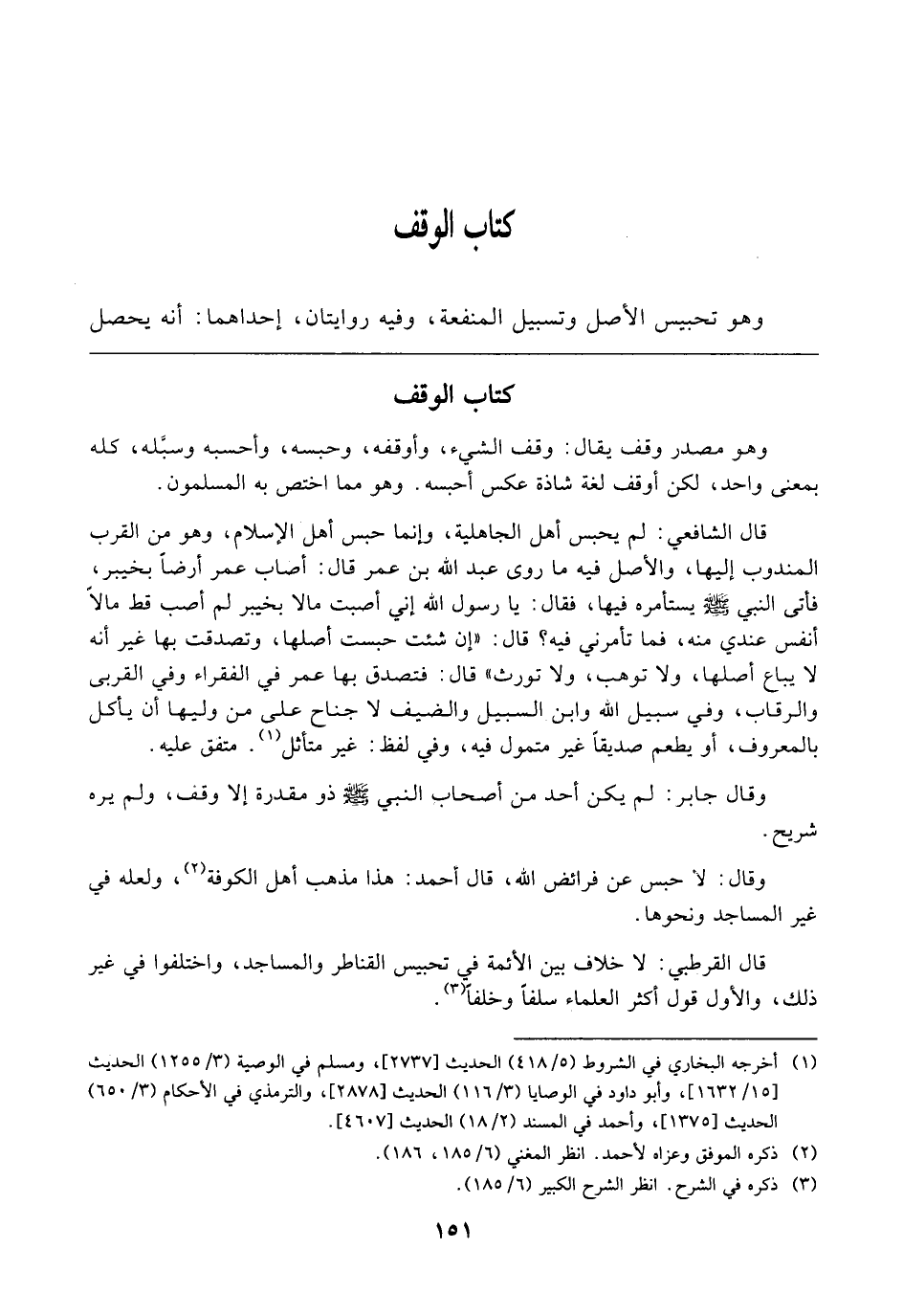 وَهُوَ مَصْدَرُ وَقَفَ، يُقَالُ: وَقَفَ الشَّيْءُ، وَأَوْقَفَهُ، وَحَبَسَهُ، وَأَحْبَسَهُ، وَسَبَّلَهُ - كُلُّهُ بِمَعْنًى وَاحِدٍ، لَكِنْ أَوْقَفَ لُغَةٌ شَاذَّةٌ عَكْسُ أَحْبِسُهُ، وَهُوَ مِمَّا اخْتَصَّ بِهِ الْمُسْلِمُونَ. قَالَ الشَّافِعِيُّ: لَمْ يَحْبِسْ أَهْلُ الْجَاهِلِيَّةِ، وَإِنَّمَا حَبَسَ أَهْلُ الْإِسْلَامِ، وَهُوَ مِنَ الْقُرَبِ الْمَنْدُوبِ إِلَيْهَا، وَالْأَصْلُ فِيهِ مَا رَوَى عَبْدُ اللَّهِ بْنُ عُمَرَ، قَالَ: «أَصَابَ عُمَرُ أَرْضًا بِخَيْبَرَ، فَأَتَى النَّبِيَّ - صَلَّى اللَّهُ عَلَيْهِ وَسَلَّمَ - يَسْتَأْمِرُهُ فِيهَا، فَقَالَ: يَا رَسُولَ اللَّهِ، إِنِّي أَصَبْتُ مَالًا بِخَيْبَرَ لَمْ أُصِبْ قَطُّ مَالًا أَنْفَسَ عِنْدِي مِنْهُ، فَمَا تَأْمُرُنِي فِيهِ؟ قَالَ: إِنْ شِئْتَ حَبَسْتَ أَصْلَهَا وَتَصَدَّقْتَ بِهَا، غَيْرَ أَنَّهُ لَا يُبَاعُ أَصْلُهَا وَلَا تُوهَبُ وَلَا تُورَثُ، قَالَ: فَتَصَدَّقَ بِهَا عُمَرُ فِي الْفُقَرَاءِ، وَفِي الْقُرْبَى، وَالرِّقَابِ، وَفِي سَبِيلِ اللَّهِ، وَابْنِ السَّبِيلِ، وَالضَّيْفِ، لَا جُنَاحَ عَلَى مَنْ وَلِيَهَا أَنْ يَأْكُلَ بِالْمَعْرُوفِ، أَوْ يُطْعِمَ صَدِيقًا غَيْرَ مُتَمَوِّلٍ فِيهِ، وَفِي لَفْظٍ - غَيْرَ مُتَأَثِّلٍ -» ، مُتَّفَقٌ عَلَيْهِ. وَقَالَ جَابِرٌ: لَمْ يَكُنْ أَحَدٌ مِنْ أَصْحَابِ النَّبِيِّ - صَلَّى اللَّهُ عَلَيْهِ وَسَلَّمَ - ذُو مَقْدِرَةٍ إِلَّا وَقَفَ. وَلَمْ يَرَهُ شُرَيْحٌ، وَقَالَ: لَا حَبْسَ عَنْ فَرَائِضِ اللَّهِ. قَالَ أَحْمَدُ: هَذَا مَذْهَبُ أَهْلِ الْكُوفَةِ، وَلَعَلَّهُ فِي غَيْرِ الْمَسَاجِدِ وَنَحْوِهَا.