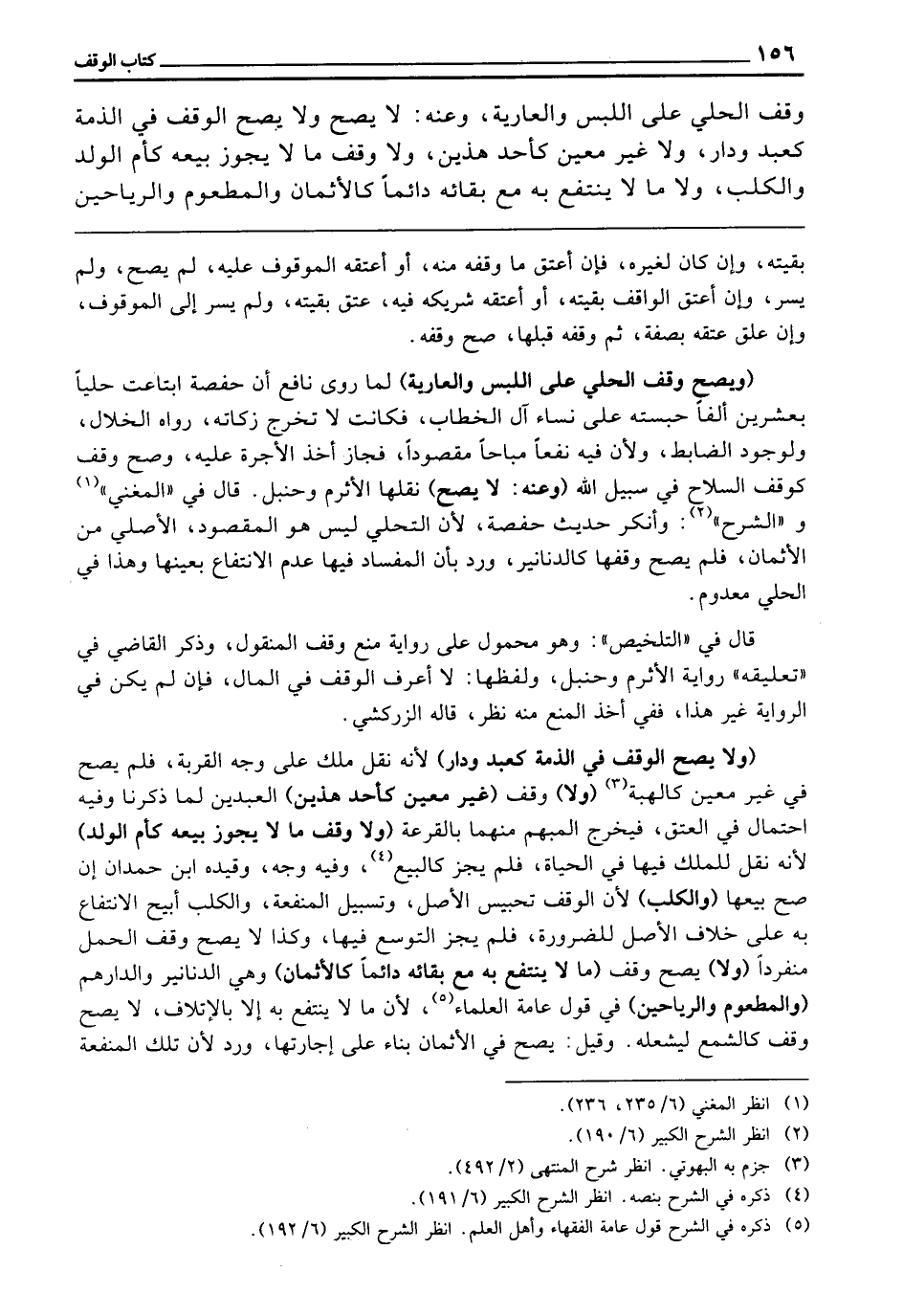 وَقْفُ الْحُلِيِّ عَلَى اللُّبْسِ وَالْعَارِيَةِ، وَعَنْهُ: لَا يَصِحُّ. وَلَا يَصِحُّ الْوَقْفُ فِي الذِّمَّةِ كَعَبْدٍ وَدَارٍ، وَلَا غَيْرِ مُعَيَّنٍ كَأَحَدِ هَذَيْنِ، وَلَا وَقْفُ مَا لَا يَجُوزُ بَيْعُهُ كَأُمِّ الْوَلَدِ وَالْكَلْبِ وَلَا مَا لَا يُنْتَفَعُ بِهِ مَعَ بَقَائِهِ دَائِمًا كالأثمان والمطعوم والرياحين.