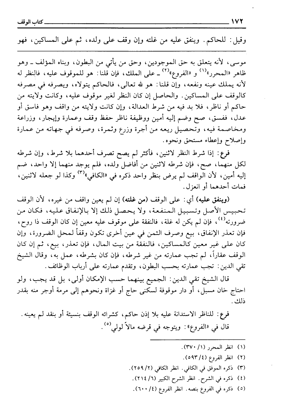 ـــــــــــــــــــــــــــــQمُوسَى؛ لِأَنَّهُ يَتَعَلَّقُ بِهِ حَقُّ الْمَوْجُودِينَ وَحَقُّ مَنْ يَأْتِي مِنَ الْبُطُونِ، وَبَنَاهُ الْمُؤَلِّفُ - وَهُوَ ظَاهِرُ " الْمُحَرَّرِ " وَ - الْفُرُوعِ " - عَلَى الْمِلْكِ، فَإِنْ قُلْنَا: هُوَ لِلْمَوْقُوفِ عَلَيْهِ فَالنَّظَرُ لَهُ؛ لِأَنَّهُ يَمْلِكُ عَيْنَهُ وَنَفْعَهُ، وَإِنْ قُلْنَا: هُوَ لِلَّهِ تَعَالَى فَالْحَاكِمُ يَتَوَلَّاهُ وَيَصْرِفُهُ فِي مَصْرِفِهِ كَالْوَقْفِ عَلَى الْمَسَاكِينِ، وَالْحَاصِلُ إِنْ كَانَ النَّظَرُ لِغَيْرِ مَوْقُوفٍ عَلَيْهِ، وَكَانَتْ وِلَايَتُهُ مَنْ حَاكَمٍ أَوْ نَاظِرٍ فَلَا بُدَّ فِيهِ مِنْ شَرْطِ الْعَدَالَةِ، وَإِنْ كَانَتْ وِلَايَتُهُ مِنْ وَاقِفٍ وَهُوَ فَاسِقٌ أَوْ عَدْلٌ، فَفَسَقَ، صَحَّ، وَضُمَّ إِلَيْهِ أَمِينٌ وَوَظِيفَةُ نَاظِرٍ، حِفْظُ وَقْفٍ، وَعِمَارَةٍ، وَإِيجَارٍ، وَزِرَاعَةٍ، وَمُخَاصَمَةٍ فِيهِ، وَتَحْصِيلُ رَيْعِهِ مِنْ أُجْرَةٍ، وَزَرْعٍ، وَثَمَرَةٍ، وَصَرْفُهُ فِي جِهَاتِهِ مِنْ عِمَارَةٍ وَإِصْلَاحٍ وَإِعْطَاءِ مُسْتَحَقٍّ وَنَحْوُهُ.