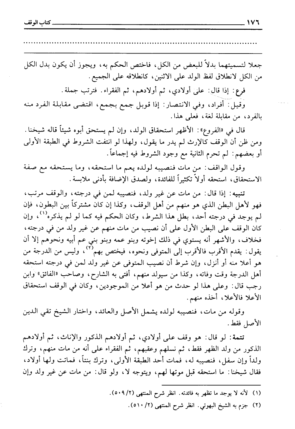 تَنْبِيهٌ: إِذَا قَالَ: مَنْ مَاتَ عَنْ غَيْرِ وَلَدٍ فَنَصِيبُهُ لِمَنْ فِي دَرَجَتِهِ، وَالْوَقْفُ مُرَتَّبٌ، فَهُوَ لِأَهْلِ الْبَطْنِ الَّذِي هُوَ مِنْهُمْ مِنْ أَهْلِ الْوَقْفِ، وَكَذَا إِنْ كَانَ مُشْتَرَكًا بَيْنَ الْبُطُونِ، فَإِنْ لَمْ يُوجَدْ فِي دَرَجَتِهِ أَحَدٌ بَطَلَ هَذَا الشَّرْطُ، وَكَانَ الْحُكْمُ فِيهِ كَمَا لَوْ لَمْ يَذْكُرْهُ، وَإِنْ كَانَ الْوَقْفُ عَلَى الْبَطْنِ الْأَوَّلِ عَلَى أَنَّ نَصِيبَ مَنْ مَاتَ مِنْهُمْ عَنْ غَيْرِ وَلَدٍ فِي دَرَجَتِهِ فَخِلَافٌ، وَالْأَشْهَرُ أَنَّهُ يَسْتَوِي فِي ذَلِكَ إِخْوَتُهُ وَبَنُو عَمِّهِ وَبَنُو بَنِي عَمِّ أَبِيهِ، وَنَحْوُهُمْ إِلَّا أَنْ يَقُولَ: يُقَدَّمُ الْأَقْرَبُ فَالْأَقْرَبُ إِلَى الْمُتَوَفَّى وَنَحْوُهُ، فَيُخْتَصُّ بِهِمْ، وَلَيْسَ مِنَ الدَّرَجَةِ مَنْ هُوَ أَعَلَى مِنْهُ أَوْ أَنْزَلُ، وَإِنْ شَرَطَ أَنَّ نَصِيبَ الْمُتَوَفَّى عَنْ غَيْرِ وَلَدٍ لِمَنْ فِي دَرَجَتِهِ اسْتَحَقَّهُ أَهْلُ الدَّرَجَةِ وَقْتَ وَفَاتِهِ، وَكَذَا مَنْ سَيُولَدُ مِنْهُمْ، أَفْتَى بِهِ الشَّارِحُ، وَصَاحِبُ " الْفَائِقِ "، وَابْنُ رَجَبٍ قَالَ: وَعَلَى هَذَا لَوْ حَدَّثَ مَنْ هُوَ أَعَلَى مِنَ الْمَوْجُودِينَ، وَكَانَ فِي الْوَقْفِ اسْتِحْقَاقُ الْأَعْلَى فَالْأَعْلَى أَخْذَهُ مِنْهُمْ، وَقَوْلُهُ: مَنْ مَاتَ فَنَصِيبُهُ لِوَلَدِهِ، يَشْمَلُ الْأَصْلَ وَالْعَائِدَ، وَاخْتَارَ الشَّيْخُ تَقِيُّ الدِّينِ الْأَصْلَ فَقَطْ.